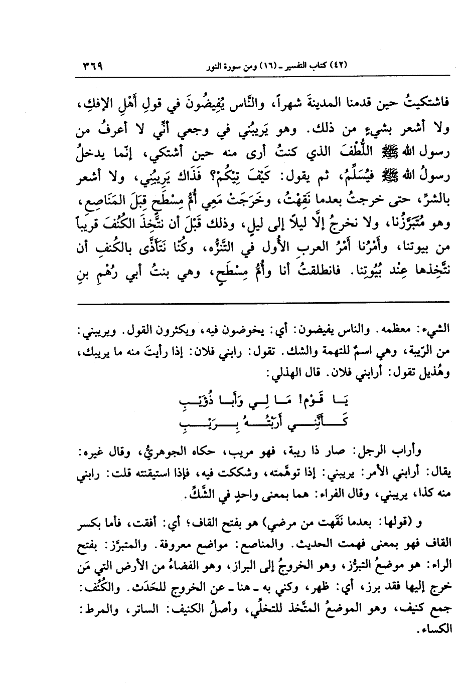 فَاشتَكَيتُ حِينَ قَدِمنَا المَدِينَةَ شَهرًا، وَالنَّاسُ يُفِيضُونَ فِي قَولِ أَهلِ الإِفكِ وَلَا أَشعُرُ بِشَيءٍ مِن ذَلِكَ، وَهُوَ يَرِيبُنِي فِي وَجَعِي أَنِّي لَا أَعرِفُ مِن رَسُولِ اللَّهِ صَلَّى اللَّهُ عَلَيهِ وَسَلَّمَ اللُّطفَ الَّذِي كُنتُ أَرَى مِنهُ حِينَ أَشتَكِي، إِنَّمَا يَدخُلُ رَسُولُ اللَّهِ صَلَّى اللَّهُ عَلَيهِ وَسَلَّمَ فَيُسَلِّمُ ثُمَّ يَقُولُ: كَيفَ تِيكُم؟ فَذَاكَ يَرِيبُنِي وَلَا أَشعُرُ بِالشَّرِّ، حَتَّى خَرَجتُ بَعدَمَا نَقَهتُ، وَخَرَجَت مَعِي أُمُّ مِسطَحٍ قِبَلَ المَنَاصِعِ، وَهُوَ مُتَبَرَّزُنَا، وَلَا نَخرُجُ إِلَّا لَيلًا إِلَى لَيلٍ، وَذَلِكَ قَبلَ أَن نَتَّخِذَ الكُنُفَ قَرِيبًا مِن بُيُوتِنَا، وَأَمرُنَا أَمرُ العَرَبِ الأُوَلِ فِي التَّنَزُّهِ، وَكُنَّا نَتَأَذَّى بِالكُنُفِ أَن نَتَّخِذَهَا عِندَ بُيُوتِنَا، فَانطَلَقتُ أَنَا وَأُمُّ مِسطَحٍ، وَهِيَ بِنتُ أَبِي رُهمِ