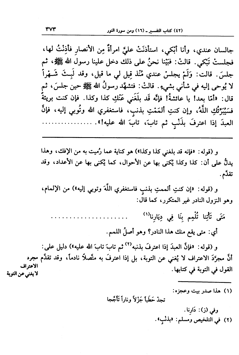 قَالَت: فَتَشَهَّدَ رَسُولُ اللَّهِ صَلَّى اللَّهُ عَلَيهِ وَسَلَّمَ حِينَ جَلَسَ، ثُمَّ قَالَ: أَمَّا بَعدُ، يَا عَائِشَةُ فَإِنَّهُ قَد بَلَغَنِي عَنكِ كَذَا وَكَذَا، فَإِن كُنتِ بَرِيئَةً فَسَيُبَرِّئُكِ اللَّهُ، وَإِن كُنتِ أَلمَمتِ بِذَنبٍ فَاستَغفِرِي اللَّهَ وَتُوبِي إِلَيهِ؛ فَإِنَّ العَبدَ إِذَا اعتَرَفَ بِذَنبٍ ثُمَّ تَابَ تَابَ اللَّهُ عَلَيهِ!