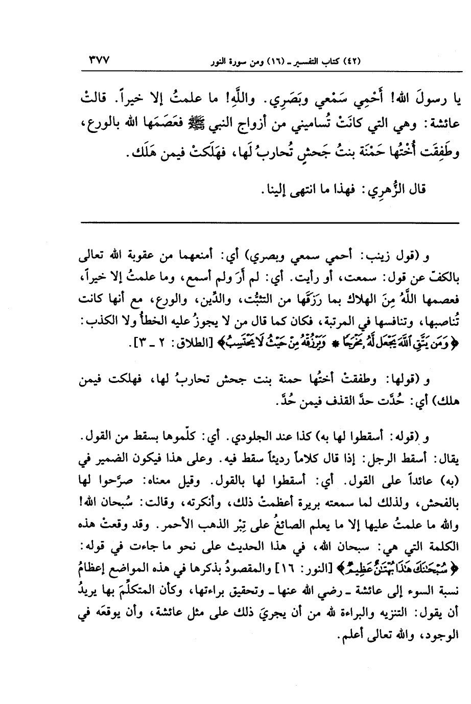 و(قول زينب أحمي سمعي وبصري)؛ أي: أمنعهما من عقوبة الله تعالى بالكف عن قول سمعت أو رأيت. أي: لم أر ولم أسمع، وما علمت إلا خيرا، فعصمها الله من الهلاك بما رزقها من التثبت والدين والورع، مع أن اكانت تناصبها وتنافسها في المرتبة، فكان كما قال من لا يجوز عليه الخطأ ولا الكذب: {وَمَن يَتَّقِ اللَّهَ يَجعَل لَهُ مَخرَجًا * وَيَرزُقهُ مِن حَيثُ لا يَحتَسِبُ}