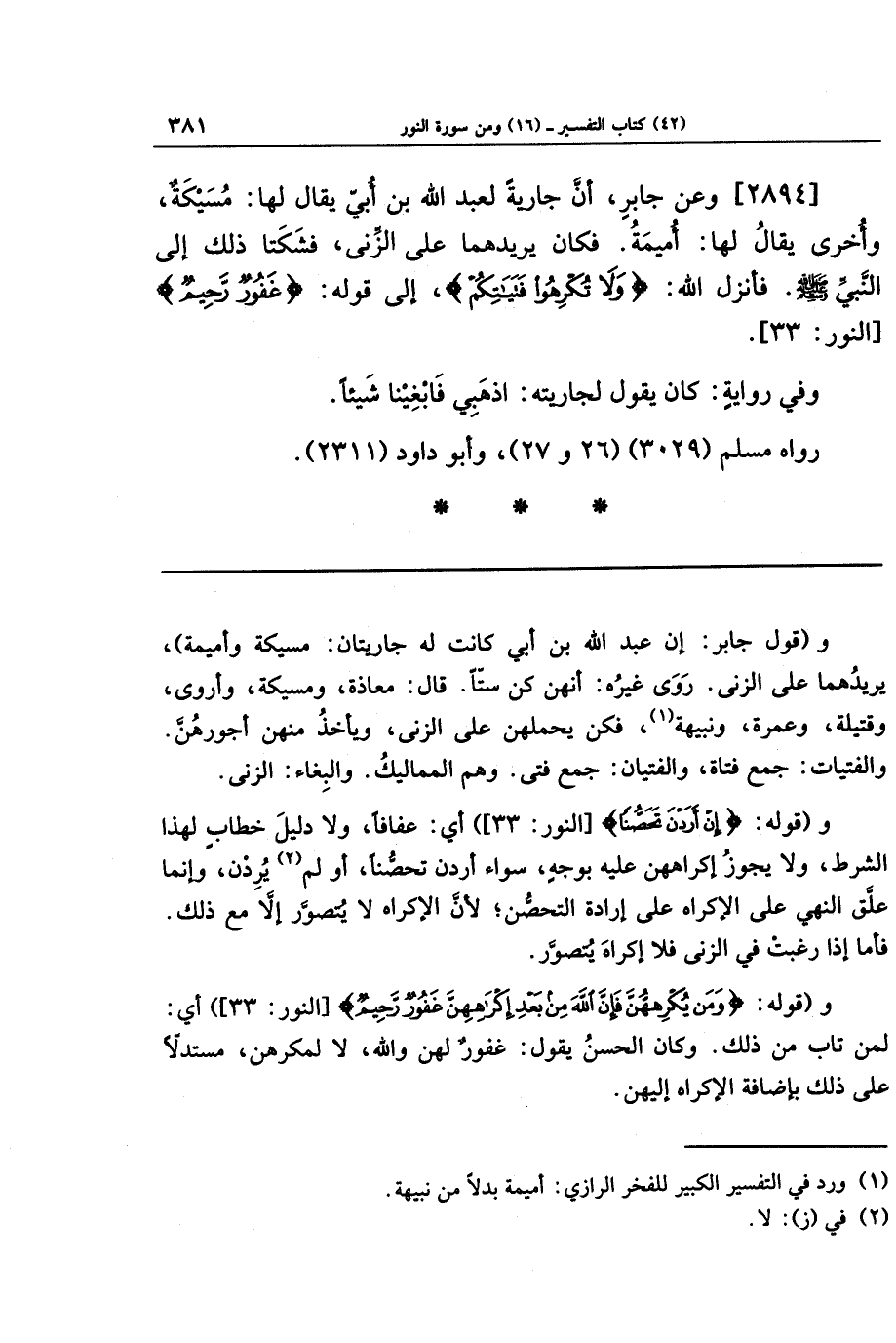 [2894] وعن جابر أن جارية لعبد الله بن أبي يقال لها مسيكة وأخرى يقال لها أميمة، فكان يريدهما على الزنى، فشكتا ذلك إلى النبي صلى الله عليه وسلم، فأنزل الله: {وَلا تُكرِهُوا فَتَيَاتِكُم} إلى قوله: {غَفُورٌ رَحِيمٌ}