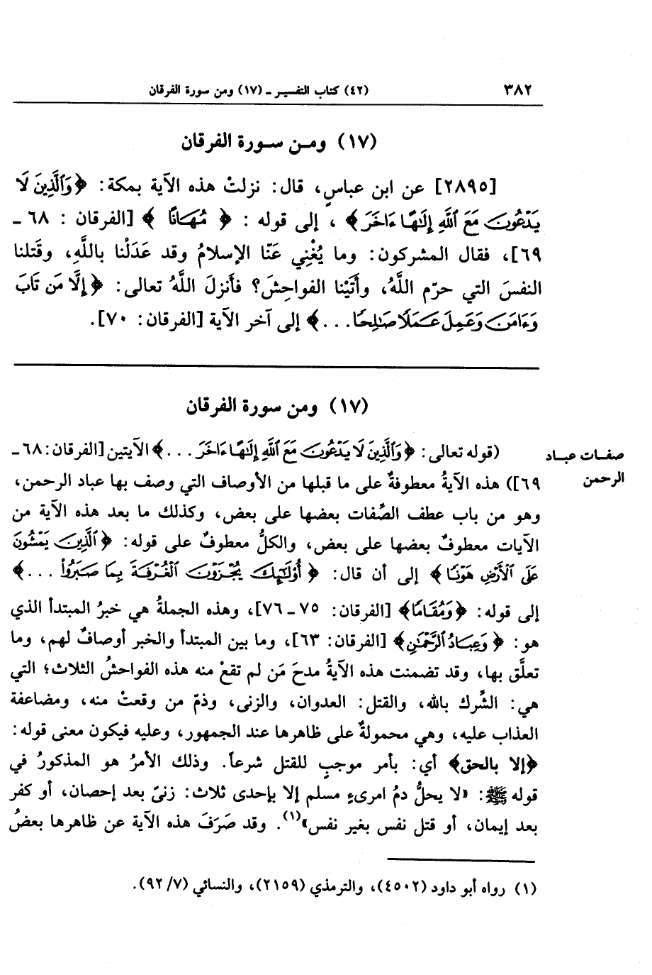 (قوله تعالى: {وَالَّذِينَ لا يَدعُونَ مَعَ اللَّهِ إِلَهًا آخَرَ}. . .) الآيتين - هذه الآية معطوفة على ما قبلها من الأوصاف التي وصف بها عباد الرحمن، وهو من باب عطف الصفات بعضها على بعض، وكذلك ما بعد هذه الآية من الآيات معطوف بعضها على بعض، والكل معطوف على قوله: {الَّذِينَ يَمشُونَ عَلَى الأَرضِ هَونًا} إلى أن قال: {أُولَئِكَ يُجزَونَ الغُرفَةَ بِمَا صَبَرُوا} إلى قوله: {وَمُقَامًا} وهذه الجملة هي خبر المبتدأ الذي هو: {وَعِبَادُ الرَّحمَنِ} وما بين المبتدأ والخبر أوصاف لهم وما تعلق بها، وقد تضمنت هذه الآية مدح من لم تقع منه هذه الفواحش الثلاث التي هي: الشرك بالله، والقتل - العدوان، والزنى. وذم من وقعت منه، ومضاعفة العذاب عليه، وهي محمولة على ظاهرها عند الجمهور، وعليه فيكون معنى قوله: {إِلا بِالحَقِّ} أي: بأمر موجب للقتل شرعا. وذلك الأمر هو المذكور في قوله صلى الله عليه وسلم: لا يحل دم امرئ مسلم إلا بإحدى ثلاث: زنى بعد إحصان، أو كفر بعد إيمان، أو قتل نفس بغير نفس (¬1). وقد صرف هذه الآية عن ظاهرها بعض