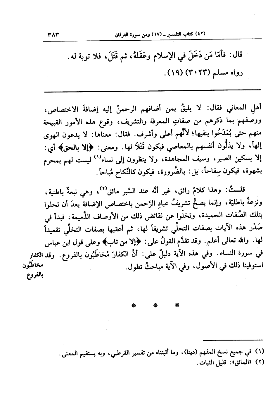 أهل المعاني فقال: لا يليق بمن أضافهم الرحمن إليه إضافة الاختصاص ووصفهم بما ذكرهم من صفات المعرفة والتشريف وقوع هذه الأمور القبيحة منهم حتى يُمدحوا بنفيها؛ لأنَّهم أعلى وأشرف. فقال: معناها لا يدعون الهوى إلها، ولا يذلون أنفسهم بالمعاصي فيكون قتلا لها. ومعنى {إِلا بِالحَقِّ} أي: إلا بسكين الصبر وسيف المجاهدة، ولا ينظرون إلى نساء (¬1) ليست لهم بمحرم بشهوة فيكون سفاحا، بل بالضرورة فيكون كالنكاح مباحًا.
