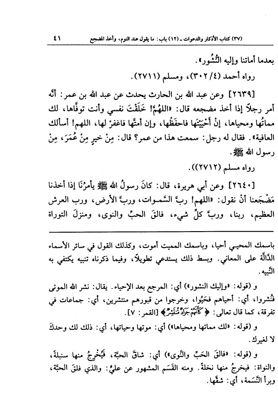 [2640] وعن أبي هريرة قال: كان رسول الله صلى الله عليه وسلم يأمرنا إذا أخذنا مضجعنا أن نقول: اللهم رب السماوات ورب الأرض ورب العرش العظيم، ربنا ورب كل شيء، فالق الحب والنوى، ومنزل التوراة