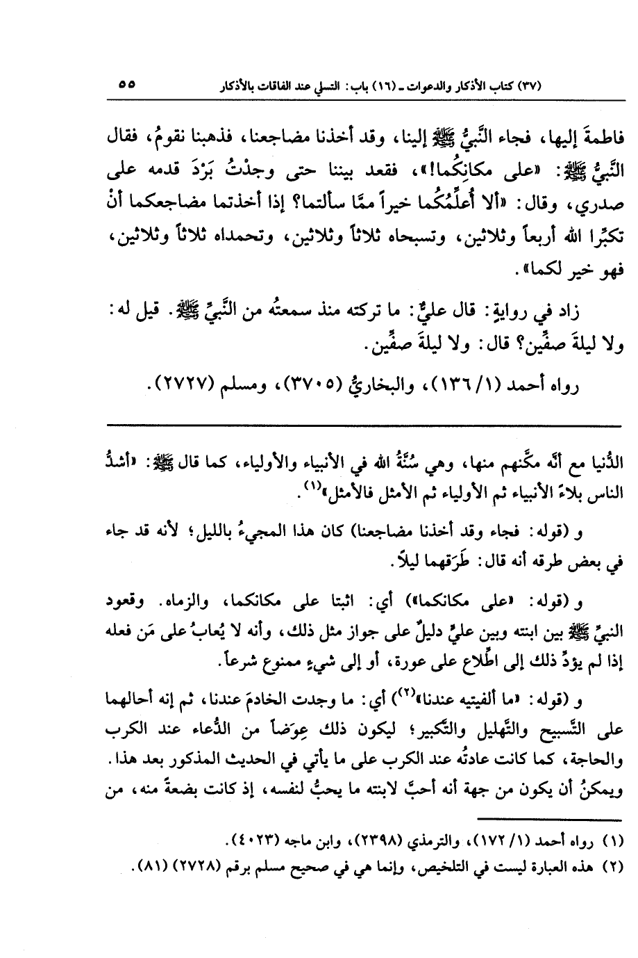 فَاطِمَةَ إِلَيهَا، فَجَاءَ النَّبِيُّ صَلَّى اللَّهُ عَلَيهِ وَسَلَّمَ إِلَينَا وَقَد أَخَذنَا مَضَاجِعَنَا فَذَهَبنَا نَقُومُ، فَقَالَ النَّبِيُّ صَلَّى اللَّهُ عَلَيهِ وَسَلَّمَ: عَلَى مَكَانِكُمَا، فَقَعَدَ بَينَنَا حَتَّى وَجَدتُ بَردَ قَدَمِهِ عَلَى صَدرِي، وقَالَ: أَلَا أُعَلِّمُكُمَا خَيرًا مِمَّا سَأَلتُمَا؟ إِذَا أَخَذتُمَا مَضَاجِعَكُمَا أَن تُكَبِّرَا اللَّهَ أَربَعًا وَثَلَاثِينَ وَتُسَبِّحَاهُ ثَلَاثًا وَثَلَاثِينَ وَتَحمَدَاهُ ثَلَاثًا وَثَلَاثِينَ، فَهوَ خَيرٌ لَكُمَا.