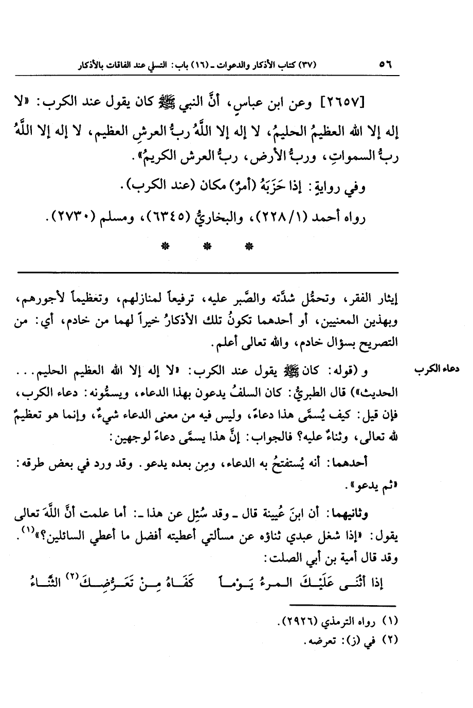 [2657] وعن ابن عباس، أن النبي صلى الله عليه وسلم كان يقول عند الكرب: لا إله إلا الله العظيم الحليم، لا إله إلا الله رب العرش العظيم، لا إله إلا الله رب السماوات ورب الأرض رب العرش الكريم.