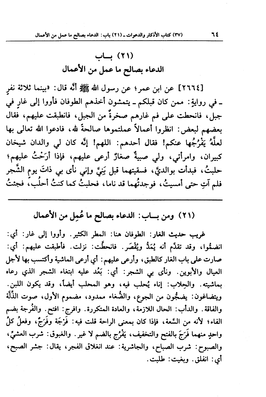 [2664] عَن ابنِ عُمَرَ عَن رَسُولِ اللَّهِ صَلَّى اللَّهُ عَلَيهِ وَسَلَّمَ، أَنَّهُ قَالَ: بَينَمَا ثَلَاثَةُ نَفَرٍ - في رواية: ممن كان قبلكم - يَتَمَشَّونَ، أَخَذَهُم الطوفان فَأَوَوا إِلَى غَارٍ فِي جَبَلٍ، فَانحَطَّت عَلَى فَمِ غَارِهِم صَخرَةٌ مِن الجَبَلِ، فَانطَبَقَت عَلَيهِم، فَقَالَ بَعضُهُم لِبَعضٍ: انظُرُوا أَعمَالًا عَمِلتُمُوهَا صَالِحَةً لِلَّهِ فَادعُوا اللَّهَ تَعَالَى بِهَا، لَعَلَّ اللَّهَ يَفرُجُهَا عَنكُم، فَقَالَ أَحَدُهُم: اللَّهُمَّ، إِنَّهُ كَانَ لِي وَالِدَانِ شَيخَانِ كَبِيرَانِ وَامرَأَتِي، وَلِي صِبيَةٌ صِغَارٌ أَرعَى عَلَيهِم، فَإِذَا أَرَحتُ عَلَيهِم حَلَبتُ فَبَدَأتُ بِوَالِدَيَّ، فَسَقَيتُهُمَا قَبلَ بَنِيَّ، وَإنّي نَأَى بِي ذَاتَ يَومٍ الشَّجَرُ فَلَم آتِ حَتَّى أَمسَيتُ، فَوَجَدتُهُمَا قَد نَامَا، فَحَلَبتُ كَمَا كُنتُ أَحلُبُ، فَجِئتُ