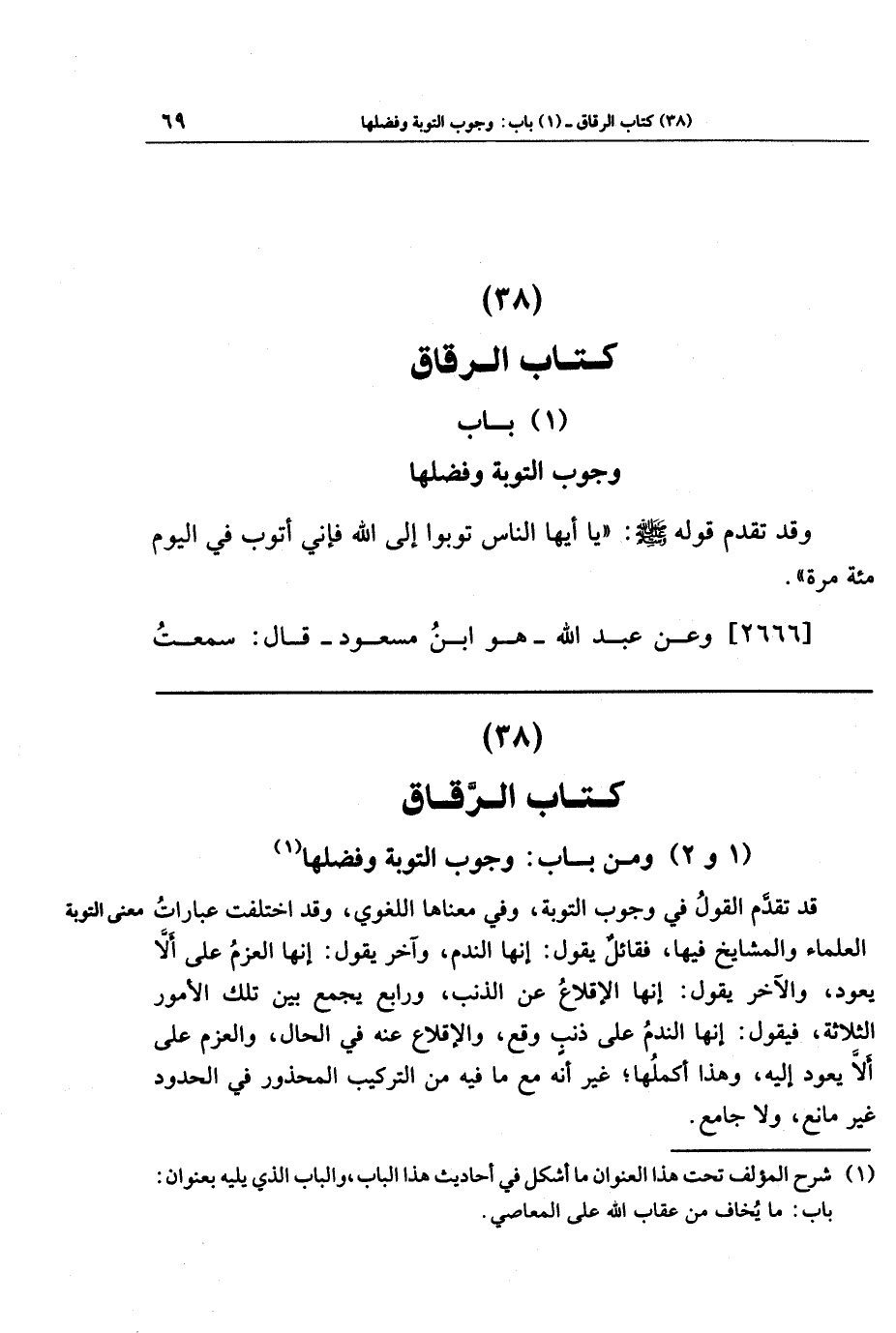 (¬1) شرح المولف تحت هذا العنوان ما أشكل في أحاديث هذا الباب، والباب الذي يليه بعنوان: باب: ما يُخاف من عقاب الله على المعاصي.