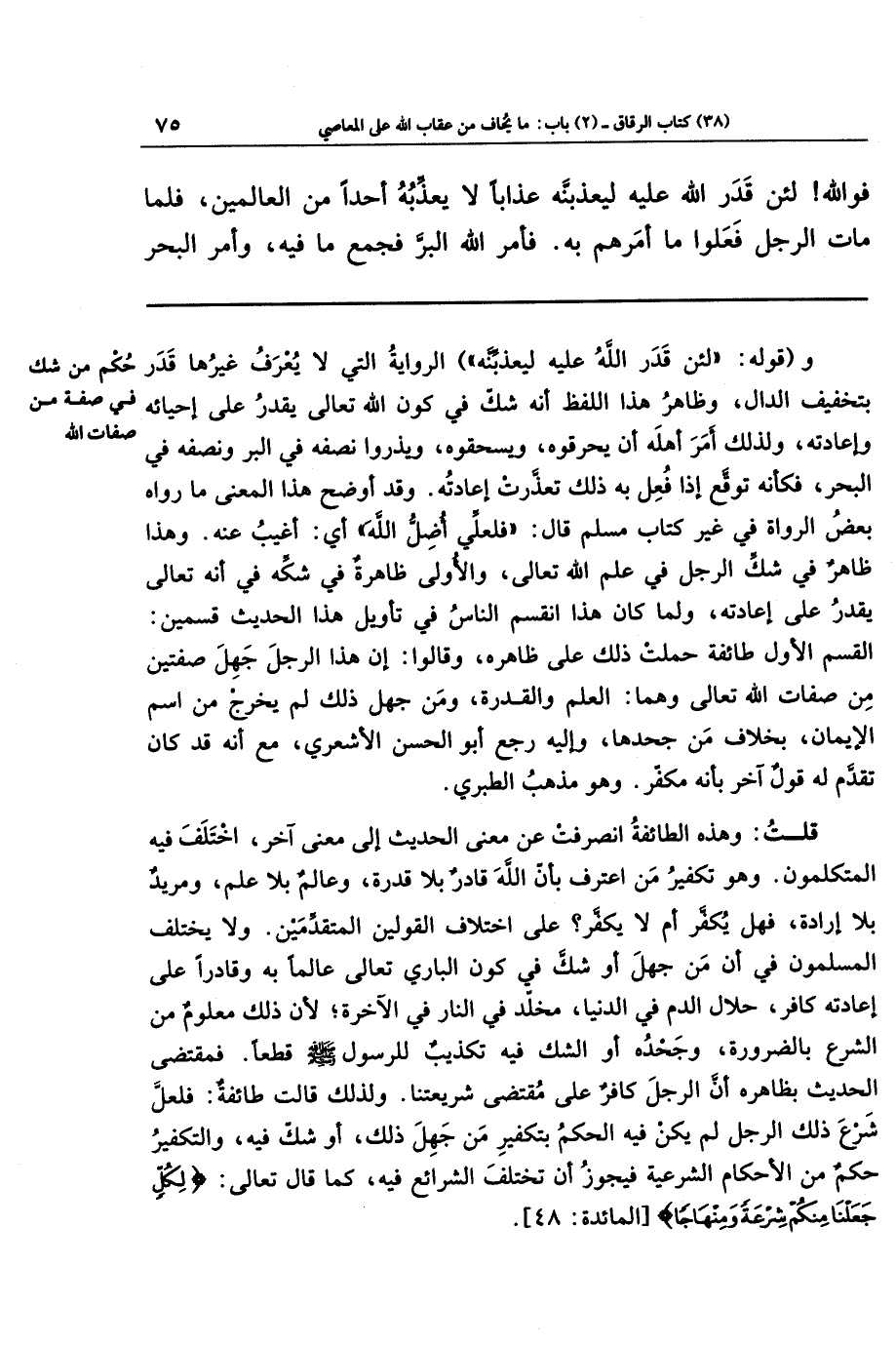 و(قوله: لئن قدر الله عليه ليعذبنه) الرواية التي لا يعرف غيرها: (قَدَر) بتخفيف الدال، وظاهر هذا اللفظ أنه شك في كون الله تعالى يقدر على إحيائه وإعادته، ولذلك أمر أهله أن يحرقوه، ويسحقوه، ويذروا نصفه في البر ونصفه في البحر، فكأنه توقع إذا فعل به ذلك تعذرت إعادته. وقد أوضح هذا المعنى ما رواه بعض الرواة في غير كتاب مسلم قال: فلعلي أُضل الله أي: أغيب عنه. وهذا ظاهر في شك الرجل في علم الله تعالى، والأولى ظاهرة في شكه في أنه تعالى يقدر على إعادته، ولما كان هذا، انقسم الناس في تأويل هذا الحديث قسمين: القسم الأول طائفة حملت ذلك على ظاهره، وقالوا: إن هذا الرجل جهل صفتين من صفات الله تعالى وهما: العلم والقدرة، ومن جهل ذلك لم يخرج من اسم الإيمان، بخلاف من جحدها، وإليه رجع أبو الحسن الأشعري، مع أنه قد كان تقدَّم له قول آخر بأنه مكفر. وهو مذهب الطبري.