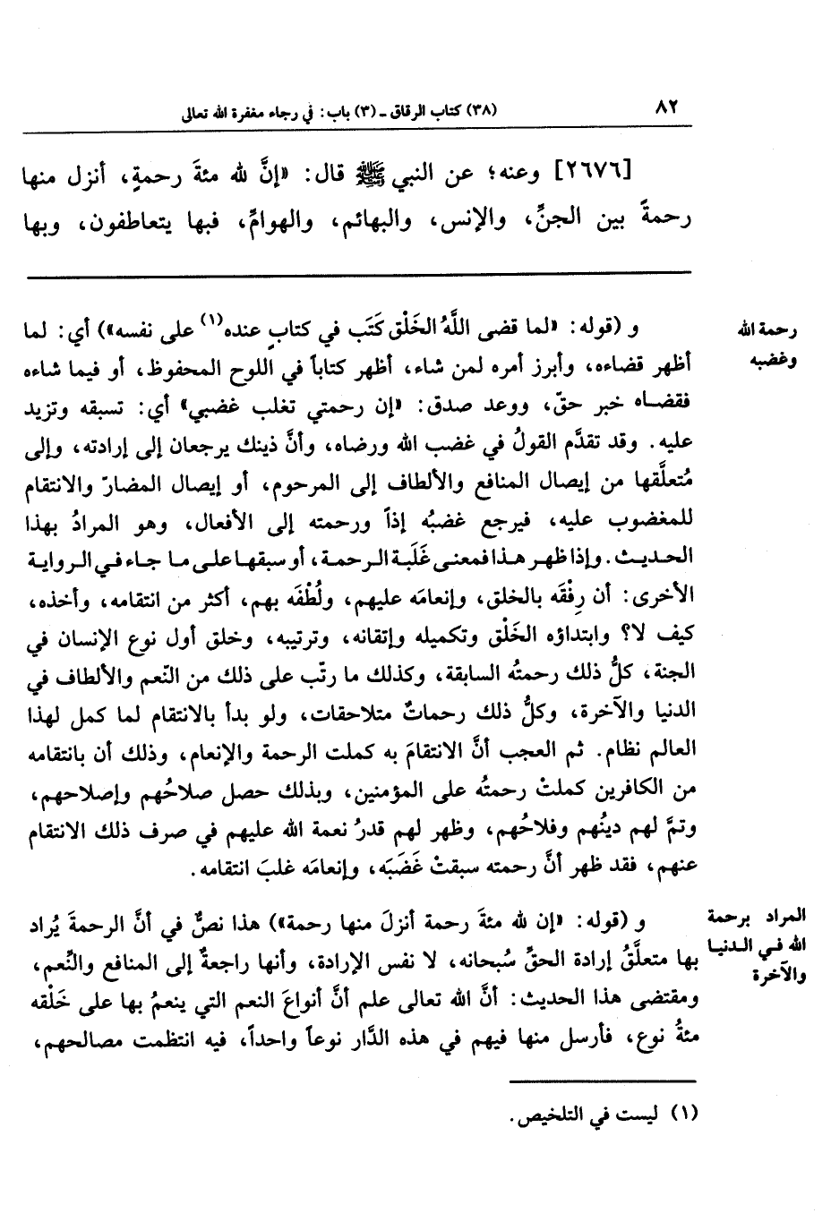 و(قوله: إن لله مائة رحمة، أنزل منها رحمة) هذا نص في أن الرحمة يراد بها متعلق إرادة الحق سبحانه، لا نفس الإرادة، وأنها راجعة إلى المنافع والنعم، ومقتضى هذا الحديث: أن الله تعالى علم أن أنواع النعم التي ينعم بها على خلقه مائة نوع، فأرسل منها فيهم في هذه الدار نوعا واحدا، فبه انتظمت مصالحهم،