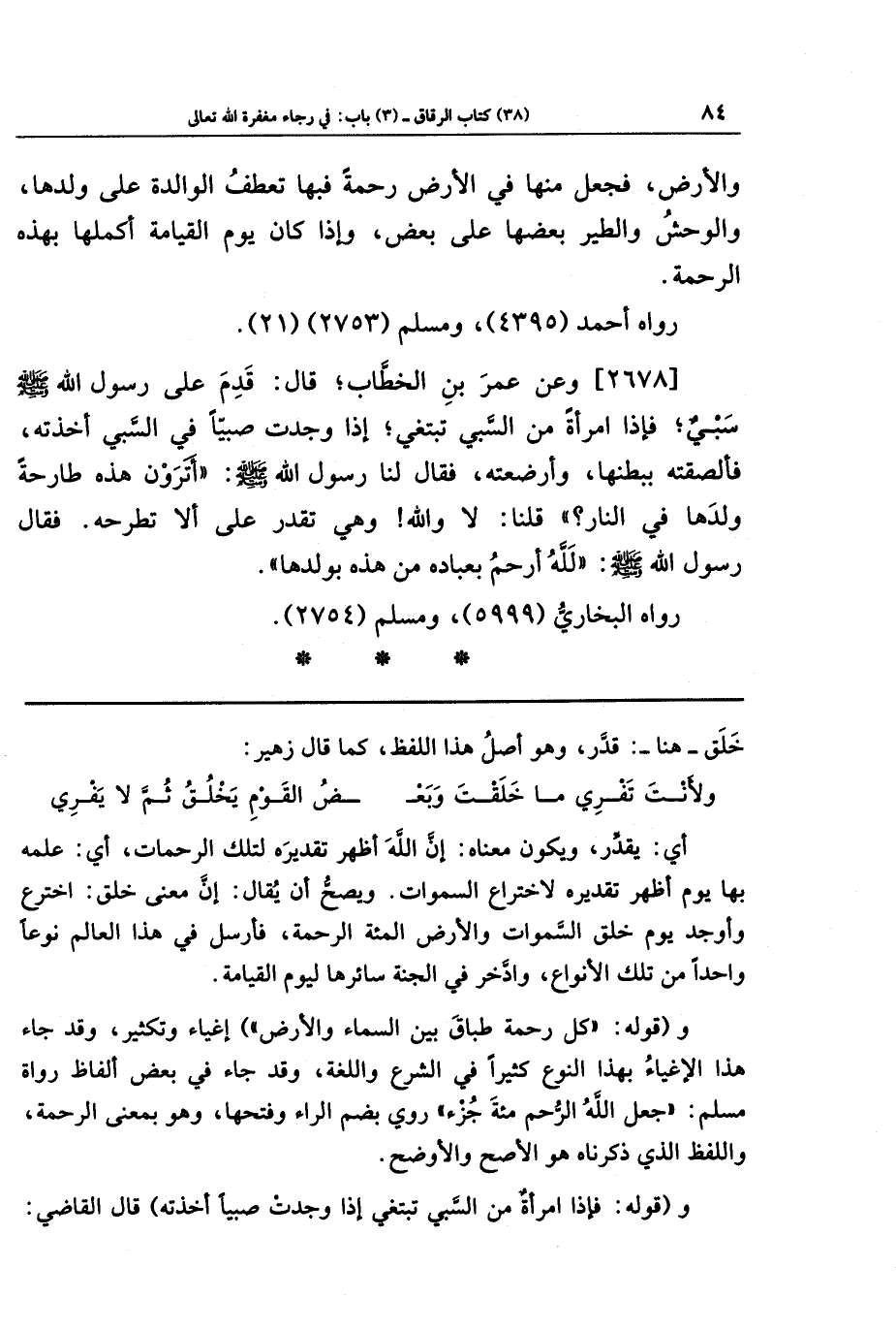 [2678] وعَن عُمَرَ بنِ الخَطَّابِ، قَالَ: قَدِمَ عَلَى رَسُولِ اللَّهِ صَلَّى اللَّهُ عَلَيهِ وَسَلَّمَ سَبي، فَإِذَا امرَأَةٌ مِن السَّبيِ تَبتَغِي، إِذَا وَجَدَت صَبِيًّا فِي السَّبيِ أَخَذَتهُ فَأَلصَقَتهُ بِبَطنِهَا وَأَرضَعَتهُ، فَقَالَ لَنَا رَسُولُ اللَّهِ صَلَّى اللَّهُ عَلَيهِ وَسَلَّمَ: أَتَرَونَ هَذِهِ المَرأَةَ طَارِحَةً وَلَدَهَا فِي النَّارِ؟ قُلنَا: لَا وَاللَّهِ وَهِيَ تَقدِرُ عَلَى أَلا تَطرَحَهُ، فَقَالَ رَسُولُ اللَّهِ صَلَّى اللَّهُ عَلَيهِ وَسَلَّمَ: لَلَّهُ أَرحَمُ بِعِبَادِهِ مِن هَذِهِ بِوَلَدِهَا.