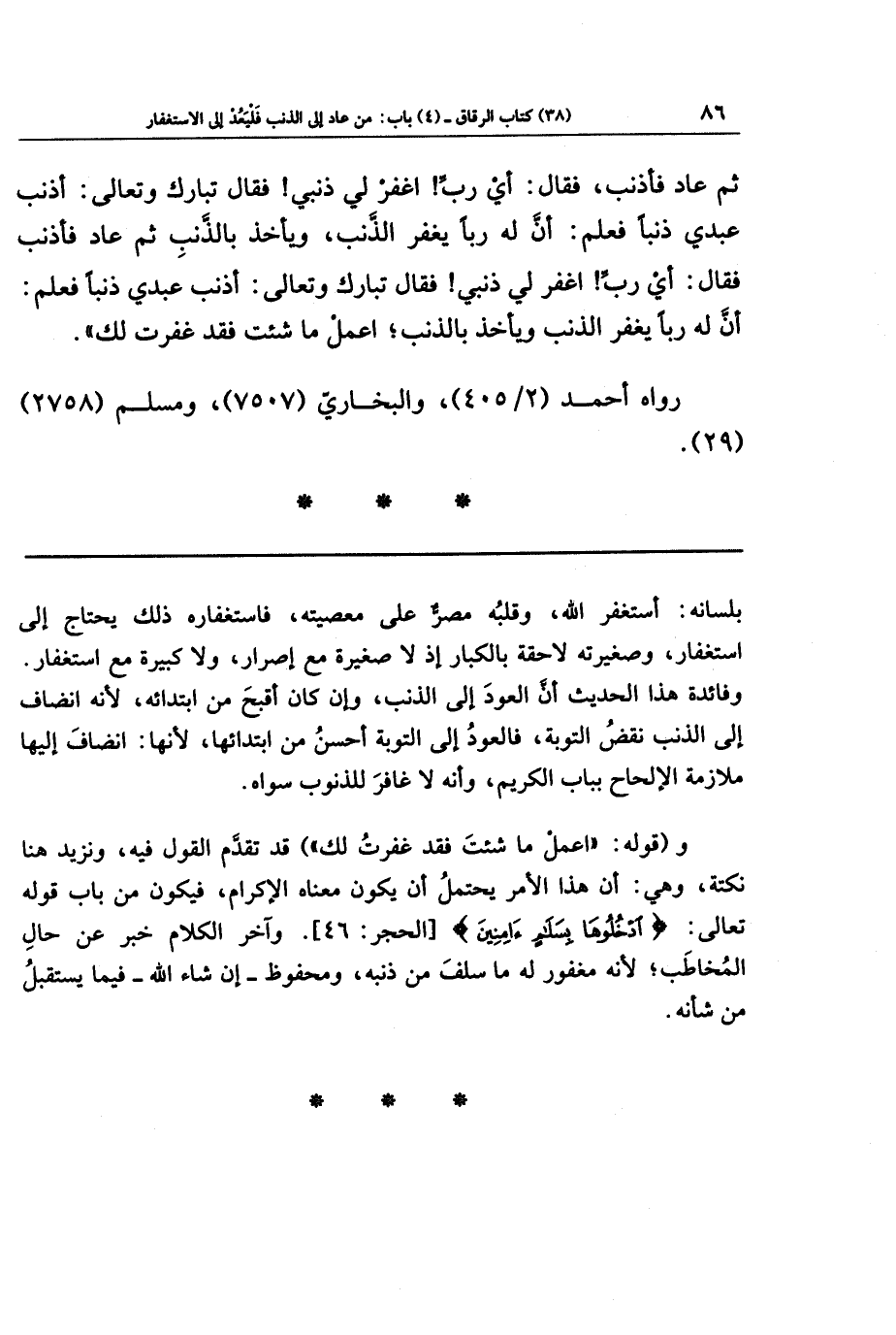 ثُمَّ عَادَ فَأَذنَبَ فَقَالَ: أَي رَبِّ، اغفِر لِي ذَنبِي، فَقَالَ تَبَارَكَ وَتَعَالَى: أَذنَبَ عَبدِي ذَنبًا فَعَلِمَ أَنَّ لَهُ رَبًّا يَغفِرُ الذَّنبَ وَيَأخُذُ بِالذَّنبِ، ثُمَّ عَادَ فَأَذنَبَ فَقَالَ: أَي رَبِّ، اغفِر لِي ذَنبِي، فَقَالَ تَبَارَكَ وَتَعَالَى: أَذنَبَ عَبدِي ذَنبًا فَعَلِمَ أَنَّ لَهُ رَبًّا يَغفِرُ الذَّنبَ وَيَأخُذُ بِالذَّنبِ، اعمَل مَا شِئتَ فَقَد غَفَرتُ لَكَ.