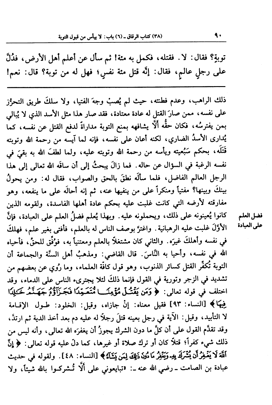 والثاني كان مشتغلا بالعلم ومعتنيا به، فوفق للحق، فأحياه الله في نفسه، وأحيا به الناس. قال القاضي: ومذهب أهل السنة والجماعة أن التوبة تكفر القتل كسائر الذنوب، وهو قول كافة العلماء، وما روي عن بعضهم من تشديد في الزجر وتورية في القول فإنما ذلك؛ لئلا يجترئ الناس على الدماء، وقد اختلف في قوله تعالى: {وَمَن يَقتُل مُؤمِنًا مُتَعَمِّدًا فَجَزَاؤُهُ جَهَنَّمُ خَالِدًا فِيهَا} فقيل: معناه: إن جازاه، وقيل: الخلود: طول الإقامة لا التأبيد، وقيل: الآية في رجل بعينه قتل رجلا له عليه دم بعد أخذ الدية، ثم ارتد، وقد تقدَّم القول على أن كل ما دون الشرك يجوز أن يغفره الله تعالى، وأنه ليس من ذلك شيء كفرا، قتلا كان أو ترك صلاة أو غيرها، كما دل عليه قوله تعالى: {إِنَّ اللَّهَ لا يَغفِرُ أَن يُشرَكَ بِهِ وَيَغفِرُ مَا دُونَ ذَلِكَ لِمَن يَشَاءُ} ولقوله في حديث عبادة بن الصامت - رضي الله عنه -: تبايعوني على ألا تشركوا بالله شيئا، ولا