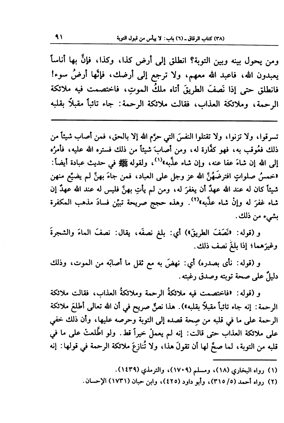 وَمَن يَحُولُ بَينَهُ وَبَينَ التَّوبَةِ؟ انطَلِق إِلَى أَرضِ كَذَا وَكَذَا، فَإِنَّ بِهَا أُنَاسًا يَعبُدُونَ اللَّهَ، فَاعبُد اللَّهَ مَعَهُم، وَلَا تَرجِع إِلَى أَرضِكَ فَإِنَّهَا أَرضُ سَوءٍ. فَانطَلَقَ حَتَّى إِذَا نَصَفَ الطَّرِيقَ أَتَاهُ ملك المَوت فَاختَصَمَت فِيهِ مَلَائِكَةُ الرَّحمَةِ، وَمَلَائِكَةُ العَذَابِ، فَقَالَت مَلَائِكَةُ الرَّحمَةِ: جَاءَ تَائِبًا مُقبِلًا بِقَلبِهِ