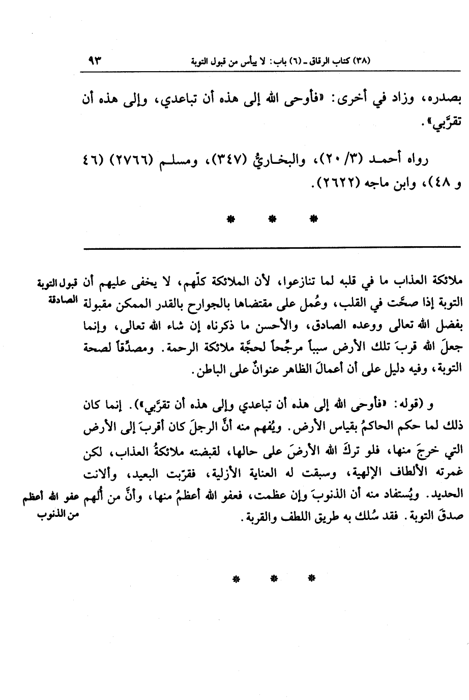 و(قوله: فأوحى الله إلى هذه أن تباعدي وإلى هذه أن تقربي). إنما كان ذلك لما حكم الحاكم بقياس الأرض. ويفهم منه أن الرجل كان أقرب إلى الأرض التي خرج منها، فلو ترك الله الأرض على حالها، لقبضته ملائكة العذاب، لكن غمرته الألطاف الإلهية، وسبقت له العناية الأزلية، فقربت البعيد، وألانت الحديد. ويستفاد منه أن الذنوب وإن عظمت، فعفو الله أعظم منها، وأن من ألهم صدق التوبة. فقد سلك به طريق اللطف والقربة.