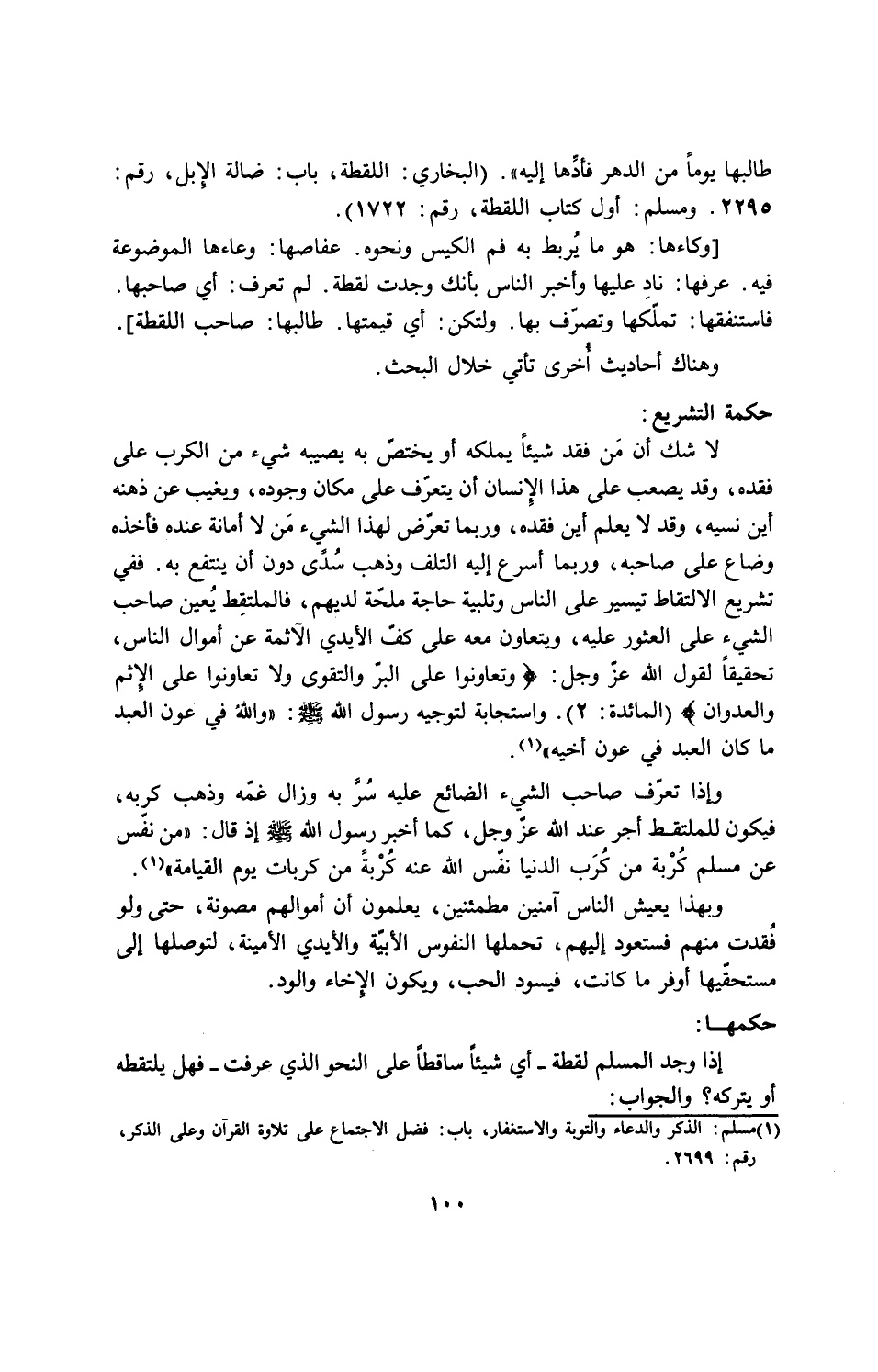 طالبها يوماً من الدهر فأدِّها إليه". (البخاري: اللقطة، باب: ضالة الإبل، رقم: 2295. ومسلم: اول كتاب اللقطة، رقم: 1722).
