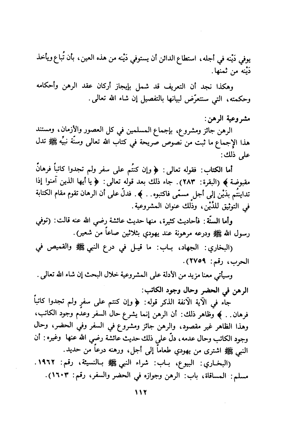 وأما السنة: فأحاديث كثيرة، منها حديث عائشة رضى الله عنه قالت: "توفي رسول الله صلى الله عليه وسلم ودرعه مرهونة عند يهودي بثلاثين صاعاً من شعير".