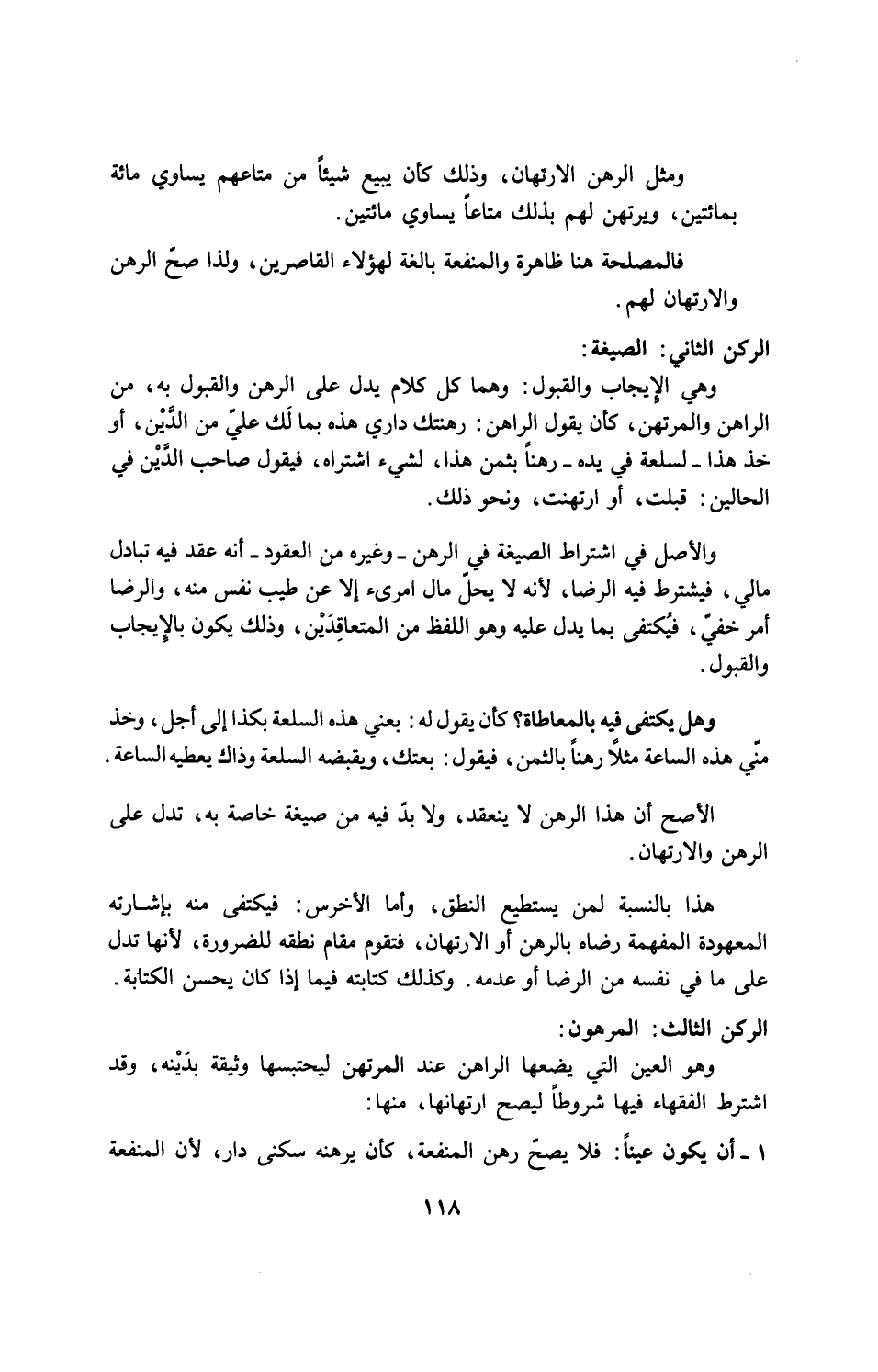 وهي الإيجاب والقبول: وهما كل كلام يدل على الرهن والقبول به، من الراهن والمرتهن، كأن يقول الراهن: رهنتك داري هذه بما لَك علىّ من الدَّين، أو خذ هذا - لسلعة في يده - رهناً بثمن هذا، لشئ اشتراه، فيقول صاحب الدين في الحالين: قبلت، أو ارتهنت، ونحو ذلك.