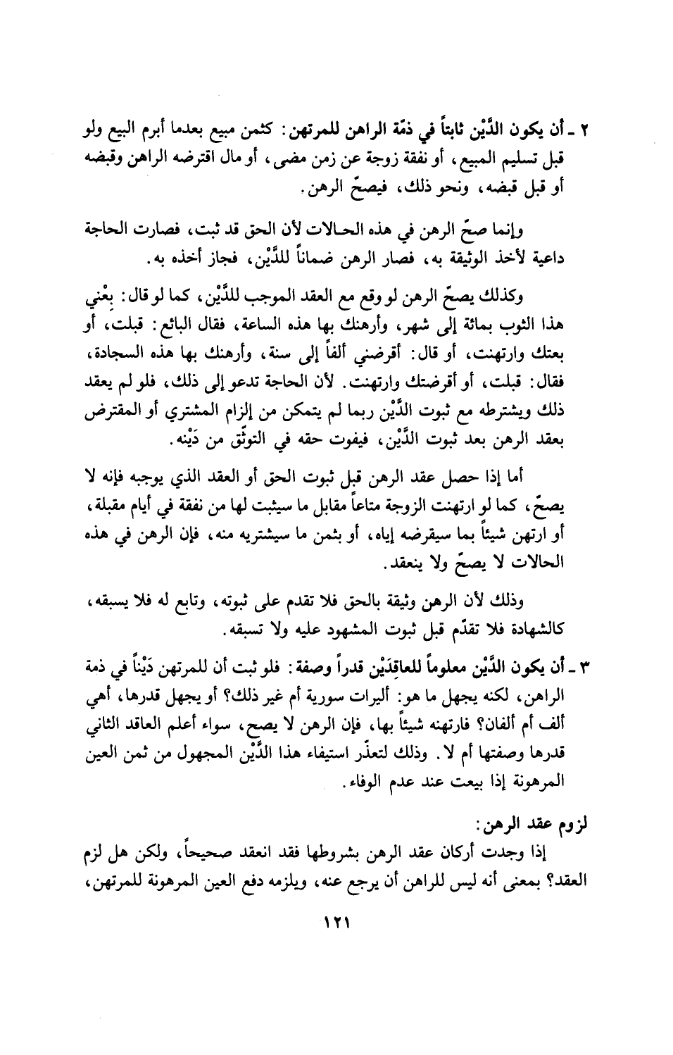 3 - أن يكون الدَّيْن معلوماً للعاقِدَيْن قدراً وصفة: فلو ثبت أن للمرتهن دَيْناً في ذمة الراهن، لكنه يجهل ما هو: أليرات سورية ام غير ذلك؟ أو يجهل قدرها، أهي الف ام الفان؟ فارتهنه شيئاً بها، فإن الرهن لا يصح، سواء أعلم العاقد الثاني قدرها وصفتها أم لا. وذلك لتعذّر استيفاء هذا الدَّيْن المجهول من ثمن العين المرهونة إذا بيعت عند عدم الوفاء.