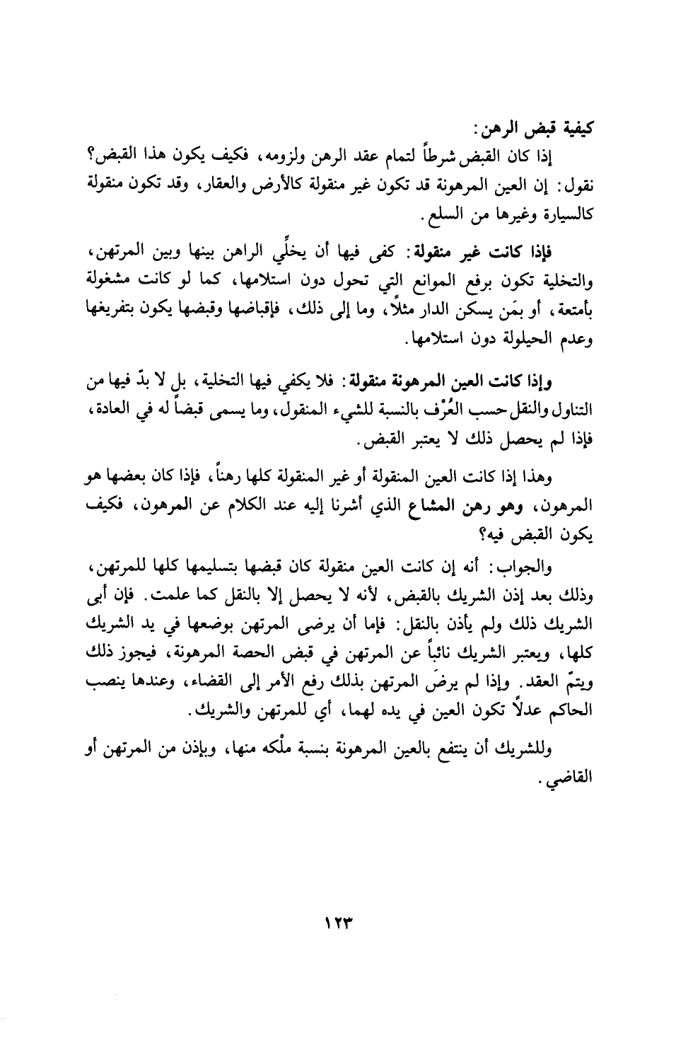 والجواب: أنه إن كانت العين منقولة كان قبضها بتسليمها كلها للمرتهن، وذلك بعد إذن الشريك بالقبض، لأنه لا يحصل إلا بالنقل كما علمت، فإن أبى الشريك ذلك ولم يأذن بالنقل: فإما أن يرضى المرتهن بوضعها في يد الشريك كلها، ويعتبر الشريك نائباً عن المرتهن في قبض الحصة المرهونة، فيجوز ذلك ويتمّ العقد، وإذا لم يرضَ المرتهن بذلك رفع الأمر الى القضاء، وعندها ينصب الحاكم عدلاً تكون العين في يده لهما، أي للمرتهن والشريك.
