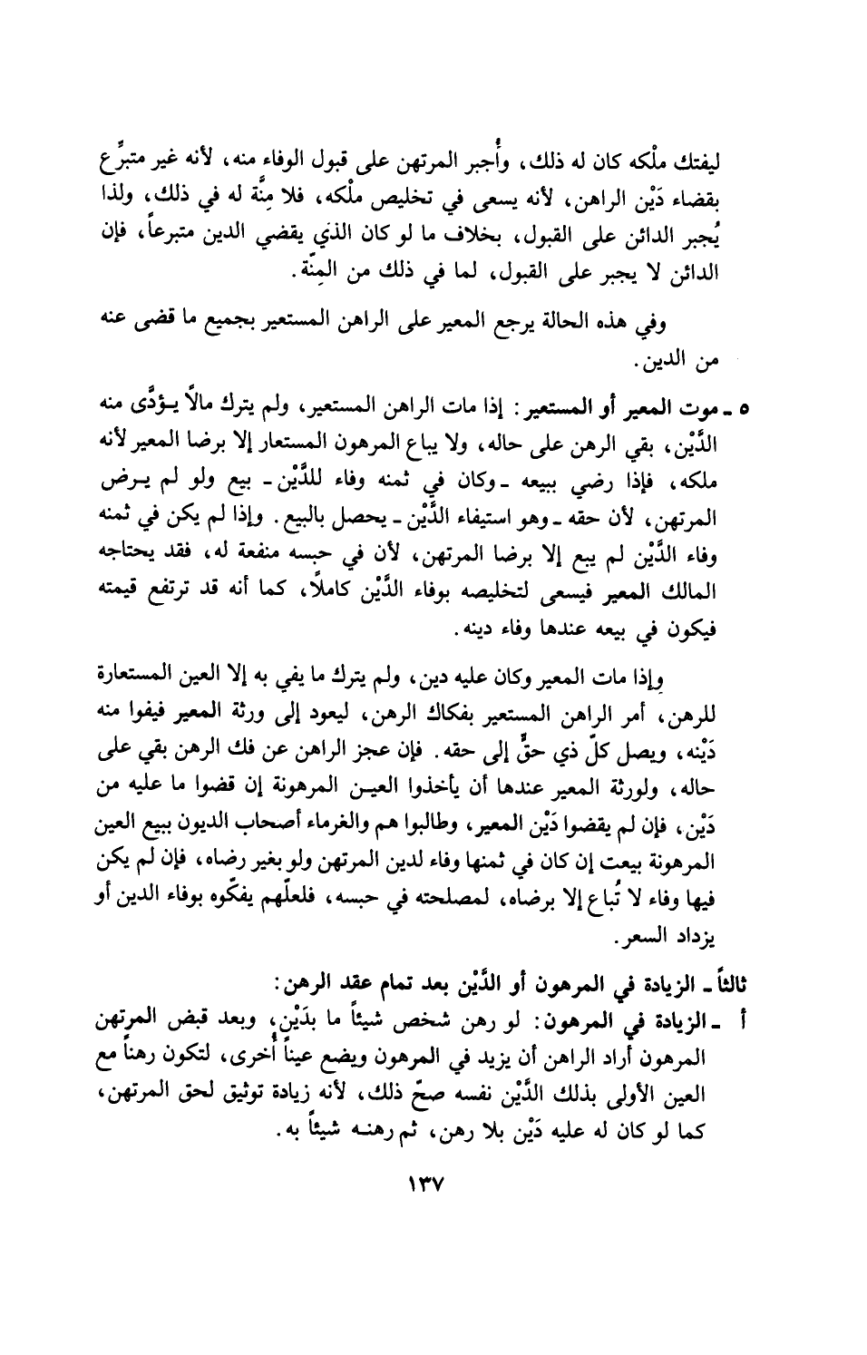 5 - موت المعير أو المستعير: إذا مات الراهن المستعير، ولم يترك مالاً يؤدَّي منه الدَّيْن، بقى الرهن على حاله، ولا يباع المرهون المستعار إلا برضا المعير لأنه ملكه، فإذا رضى ببيعه - وكان في ثمنه وفاء للدَّيْن - بيع ولو لم يرض المرتهن، لأن حقه - وهو استيفاء الدَّيْن - يحصل بالبيع. وإذا لم يكن في ثمنه وفاء الدَّيْن لم يبع إلا برضا المرتهن، لأن في حبسه منفعة له، فقد يحتاجه المالك المعير فيسعى لتخليصه بوفاء الدَّيْن كاملاً، كما أنه قد ترتفع قيمته فيكون في بيعه عندها وفاء دينه.