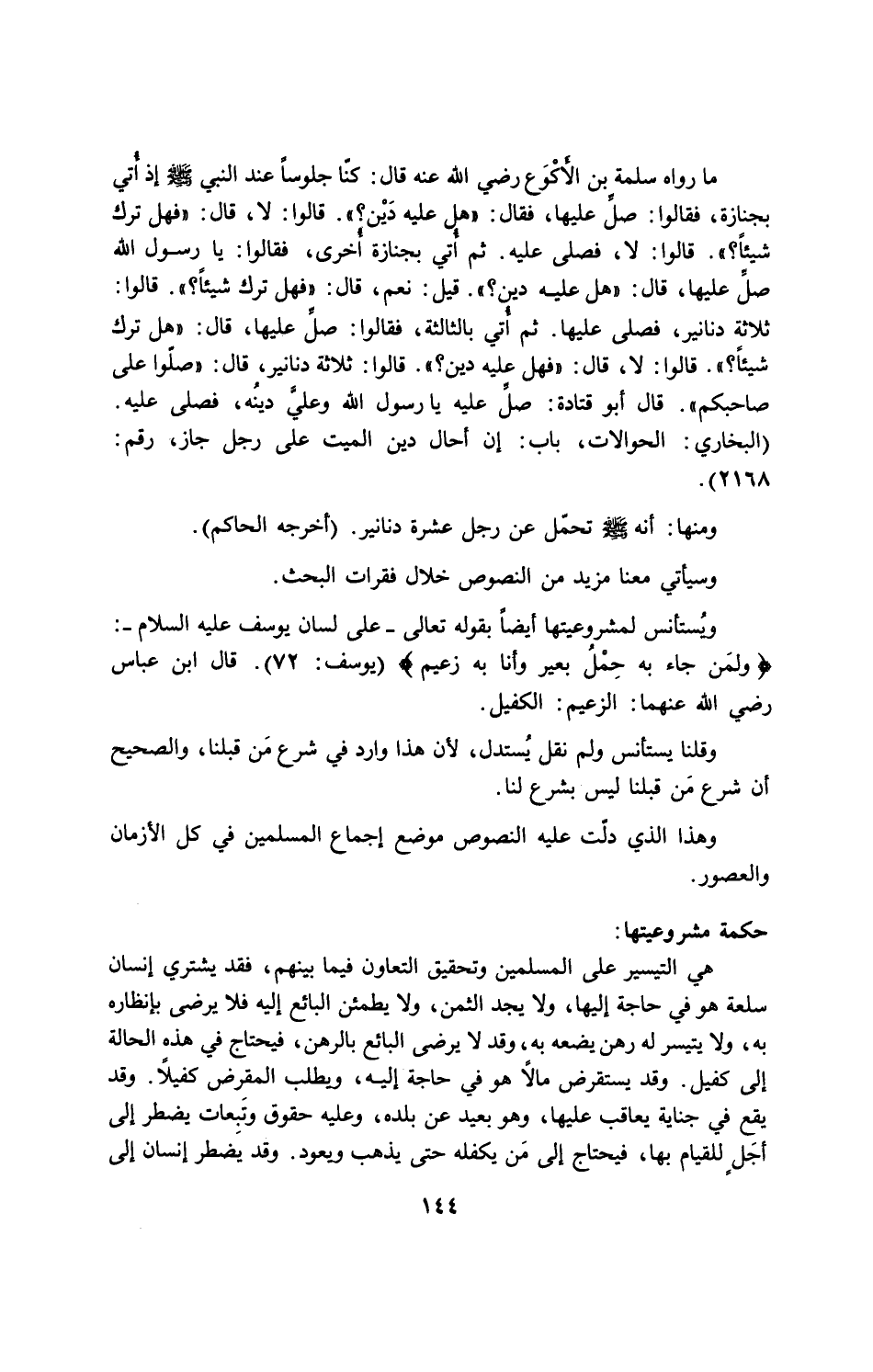 ما رواه سلمة بن الأكْوَع رضى الله عنه قال: كناً جلوساً عند النبي صلى الله عليه وسلم إذ أتى بجنازة، فقالوا: صلِّ عليها فقال: "هل عليه دَيْن؟ " قالوا: لا، قال: "فهل ترك شيئاً؟ " قالوا: لا، فصلى عليه، ثم أتى بجنازة أُخرى، فقالوا: يا رسول الله صلِّ عليها، قال " هل عليه دين؟ " قيل: نعم، قال: " فهل ترك شيئاً؟ ". قالوا: ثلاثة دنانير، فصلى عليها. ثم أُتي بالثالثة، فقالوا صلِّ عليها، قال" هل ترك شيئاً؟ " قالوا: لا قال " فهل عليه دين؟ " قالوا: ثلاثة دنانير، قال " صلّوا على صاحبكم " قال أبو قتادة: صلِّ عليه يا رسول الله وعلىَّ دينُه فصلى عليه. (البخاري: الحوالات، باب: ان احال دين الميت على رجل جاز، رقم: 2168)