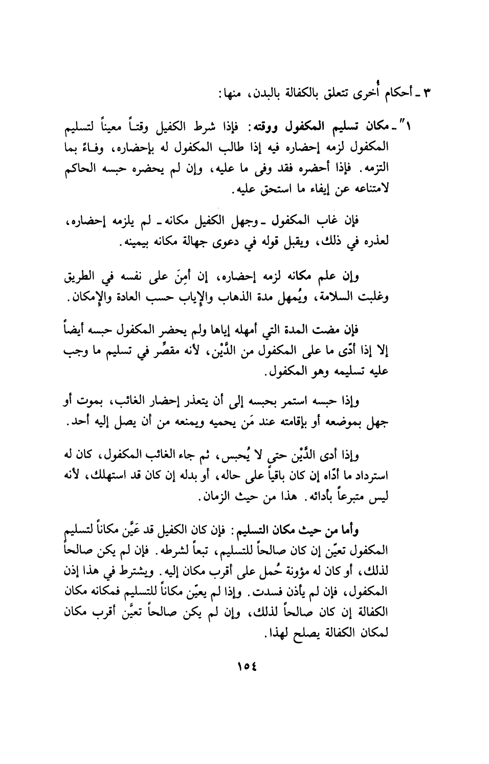 1= مكان تسليم المكفول ووقته: فإذا شرط الكفيل وقتاً معيناً لتسليم المكفول لزمه احضاره فيه اذا طالب المكفول له بإحضاره، وفاء بما التزمه، فإذا احضره فقد وفى ما عليه، وان لم يحضره حبسه الحاكم لامتناعه عن إيفاء ما استحق عليه.