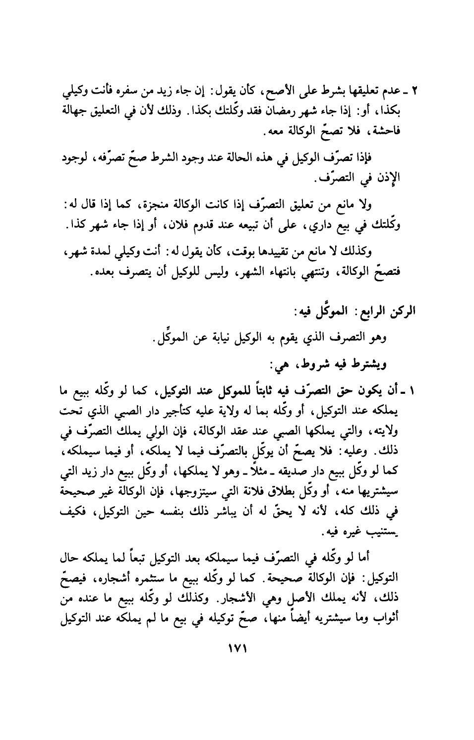 2 - عدم تعليقها بشرط على الأصح، كأن يقول: إن جاء زيد من سفره فأنت وكيلي بكذا، أو: إذا جاء شهر رمضان فقد وكّلتك بكذا، وذلك لأن في التعليق جهالة فاحشة، فلا تصحّ الوكالة معه.
