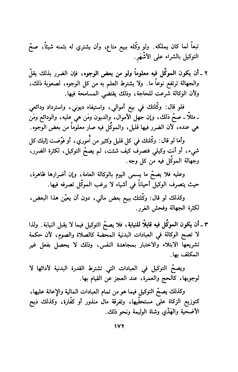 3 - أن يكون الموكِّل فيه قابلاً للنيابة، فلا يصحّ التوكيل فيما لا يقبل النيابة، ولذا لا تصح الوكالة في العبادات البدنية المحضة كالصلاة والصوم، لأن حكمة تشريعها الابتلاء والاختبار بمجاهدة النفس، وذلك لا يحصل بفعل غير المكلف بها.