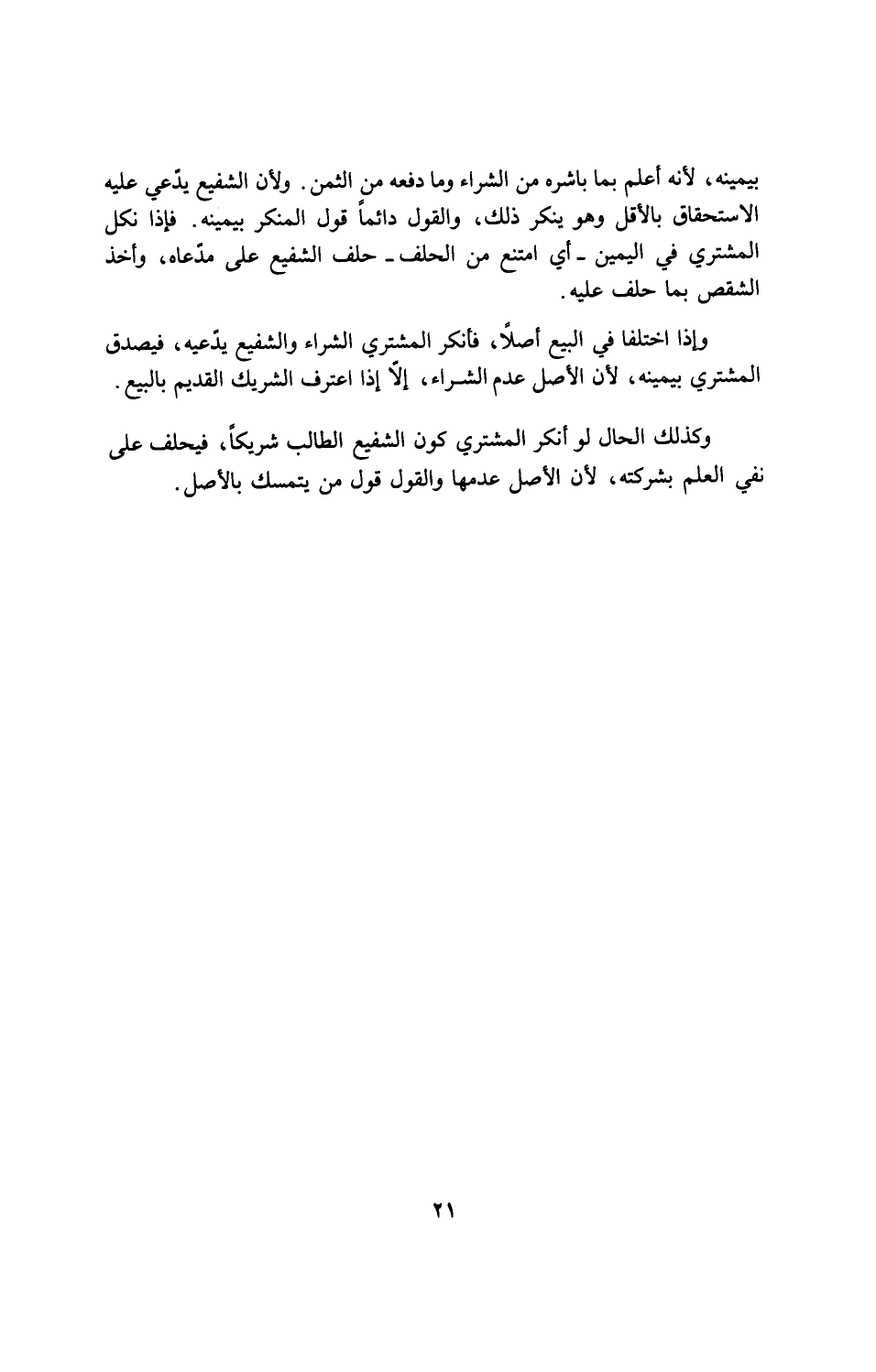 واذا اختلفا في البيع اصلا، فأنكر المشتري الشراء والشفيع يدعيه، فيصدق المشتري بيمينه، لأن الأصل عدم الشراء، إلا اذا اعترف الشريك القديم بالبيع.