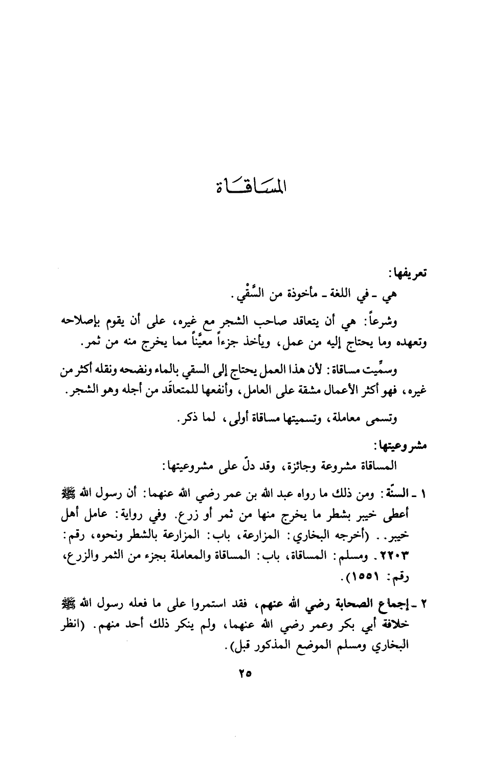 وشرعا: هي ان يتعاقد صاحب الشجر مع غيره، على ان يقوم بإصلاحه وتعهده وما يحتاج إليه من عمل، ويأخذ جزءا معينا مما يخرج منه من ثمر.