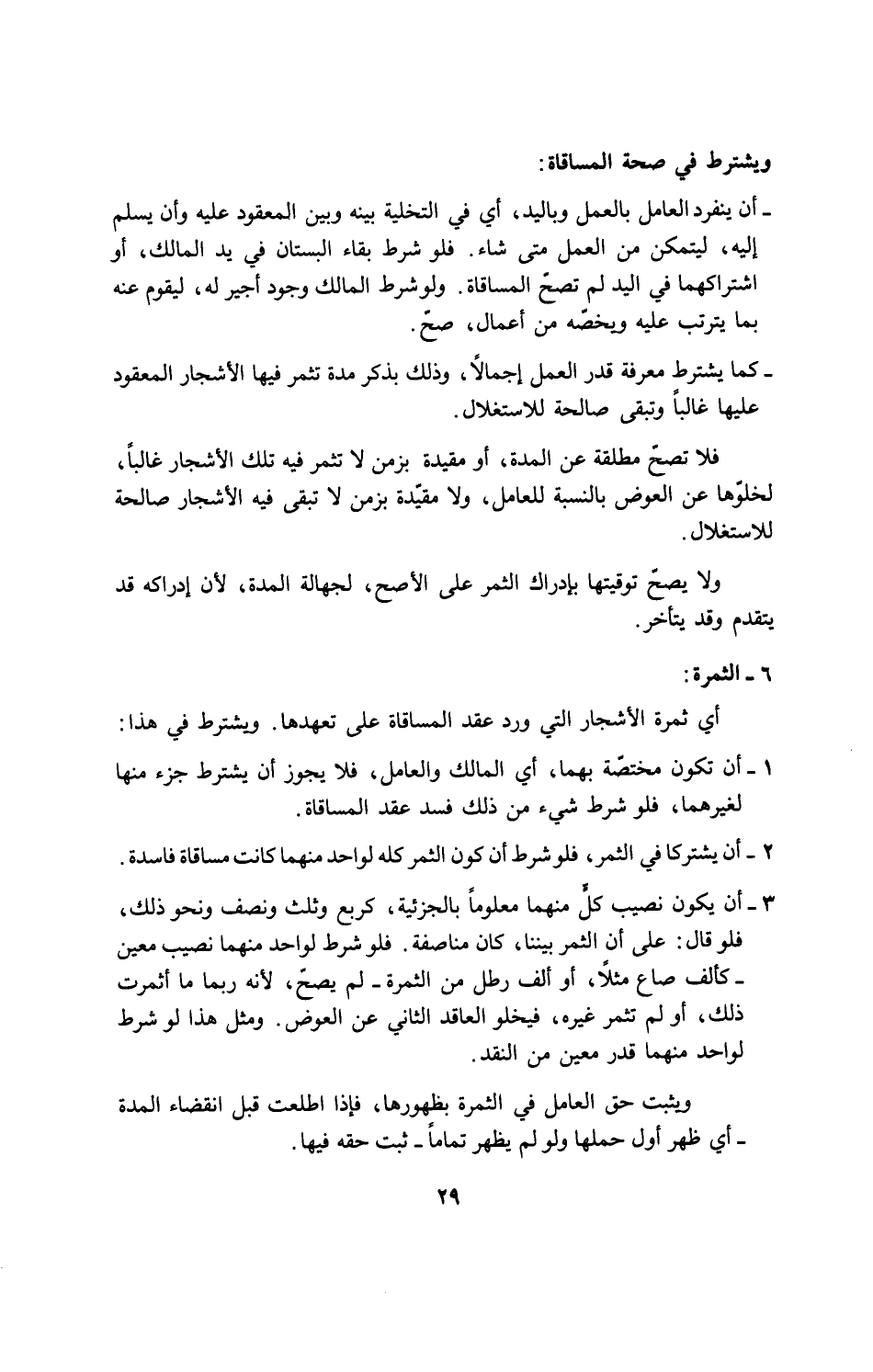 - كما يشترط معرفة قدر العمل إجمالا، وذلك بذكر مدة تثمر فيها الأشجار المعقود عليها غالبا وتبقى صالحة للاستغلال.