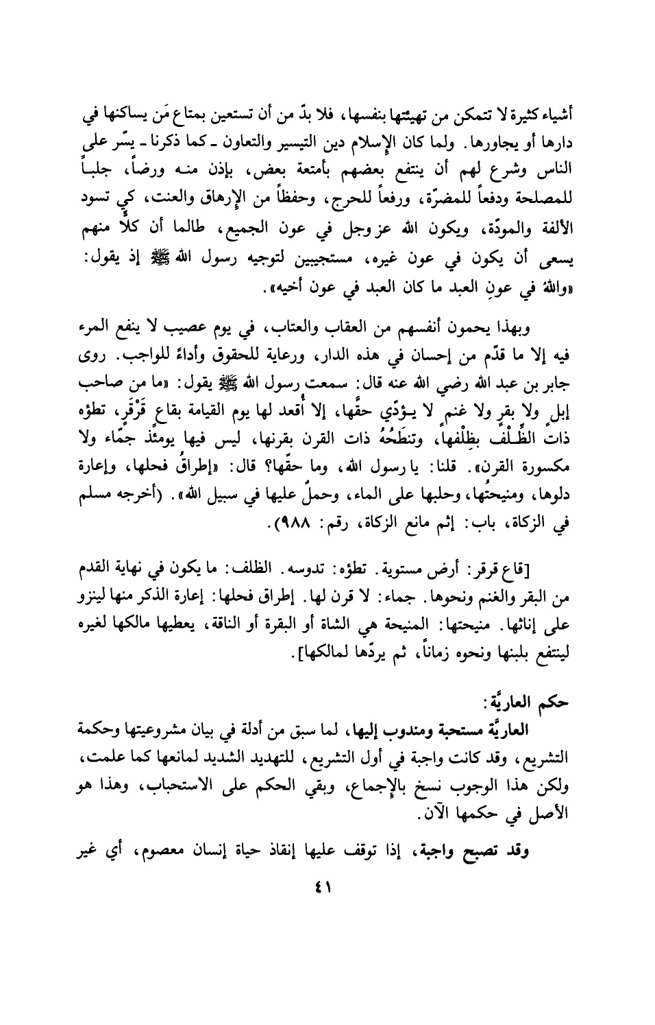 اشياء كثيرة لا تتمكن من تهيئتها بنفسها، فلا بد من ان تستعين بمتاع من يساكنها في دارها او يجاورها. ولما كان الاسلام دين التيسير والتعاون - كما ذكرنا - يسّر على الناس وشرع لهم ان ينتفع بعضهم بأمتعة بعض، بإذن منه ورضا، جلبا للمصلحة ودفعا للمضرة، ورفعا للحرج، وحفظا من الارهاق والعنت، كي تسود الألفة والمودة، ويكون الله عز وجل في عون الجميع، طالما ان كلا منهم يسعى ان يكون في عون غيره، مستجيبين لتوجيه رسول الله صلى الله عليه وسلم اذ يقول: "والله في عون العبد ما كان العبد في عون أخيه".