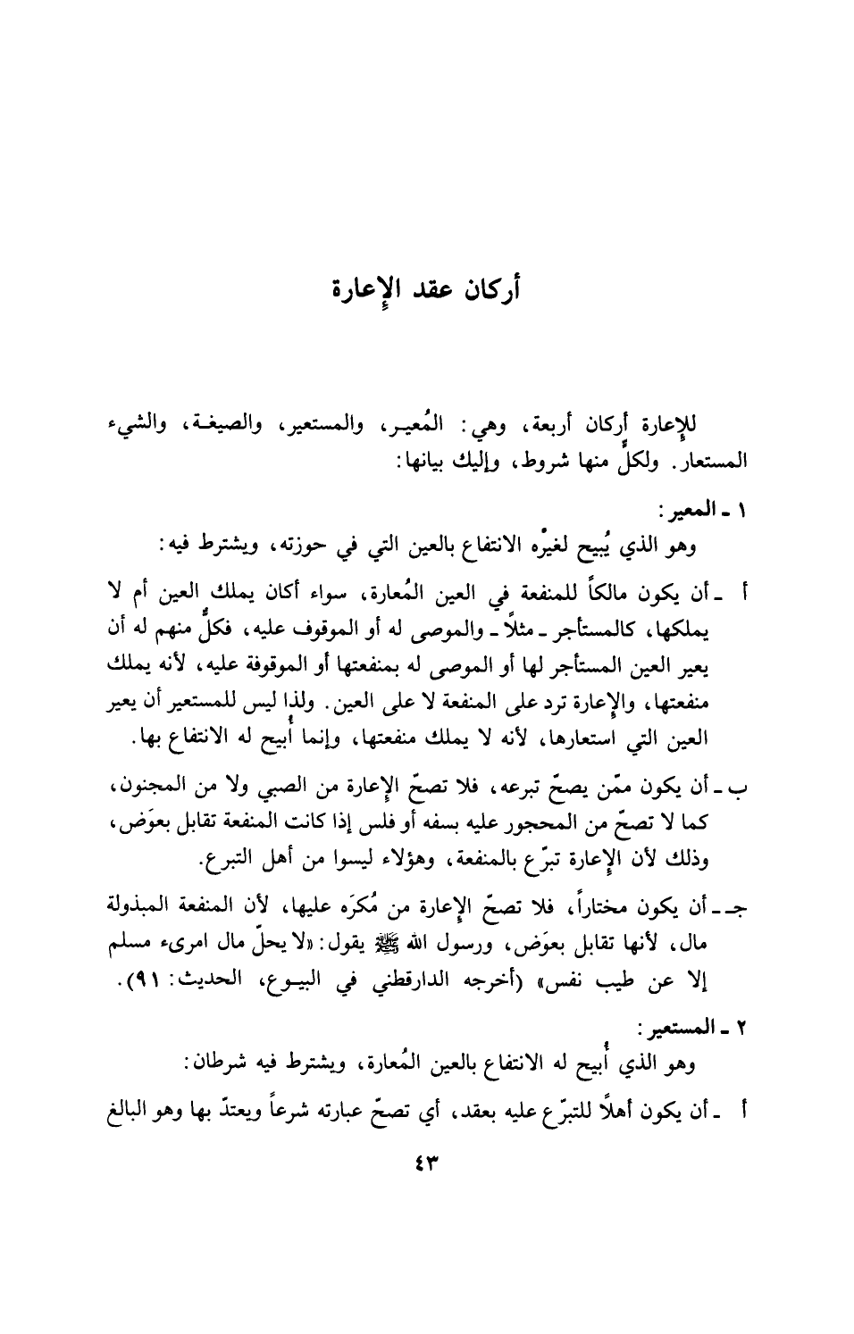 ج- أن يكون مختاراً، فلا تصحّ الإعارة من مُكرَه عليها، لأن المنفعة المبذولة مال، لأنها تقابل بعوض، ورسول الله صلى الله عليه وسلم يقول: "لا يحلّ مال امرئ مسلم الا عن طيب نفس" (اخرجه الدارقطني في البيوع، الحديث: 91).