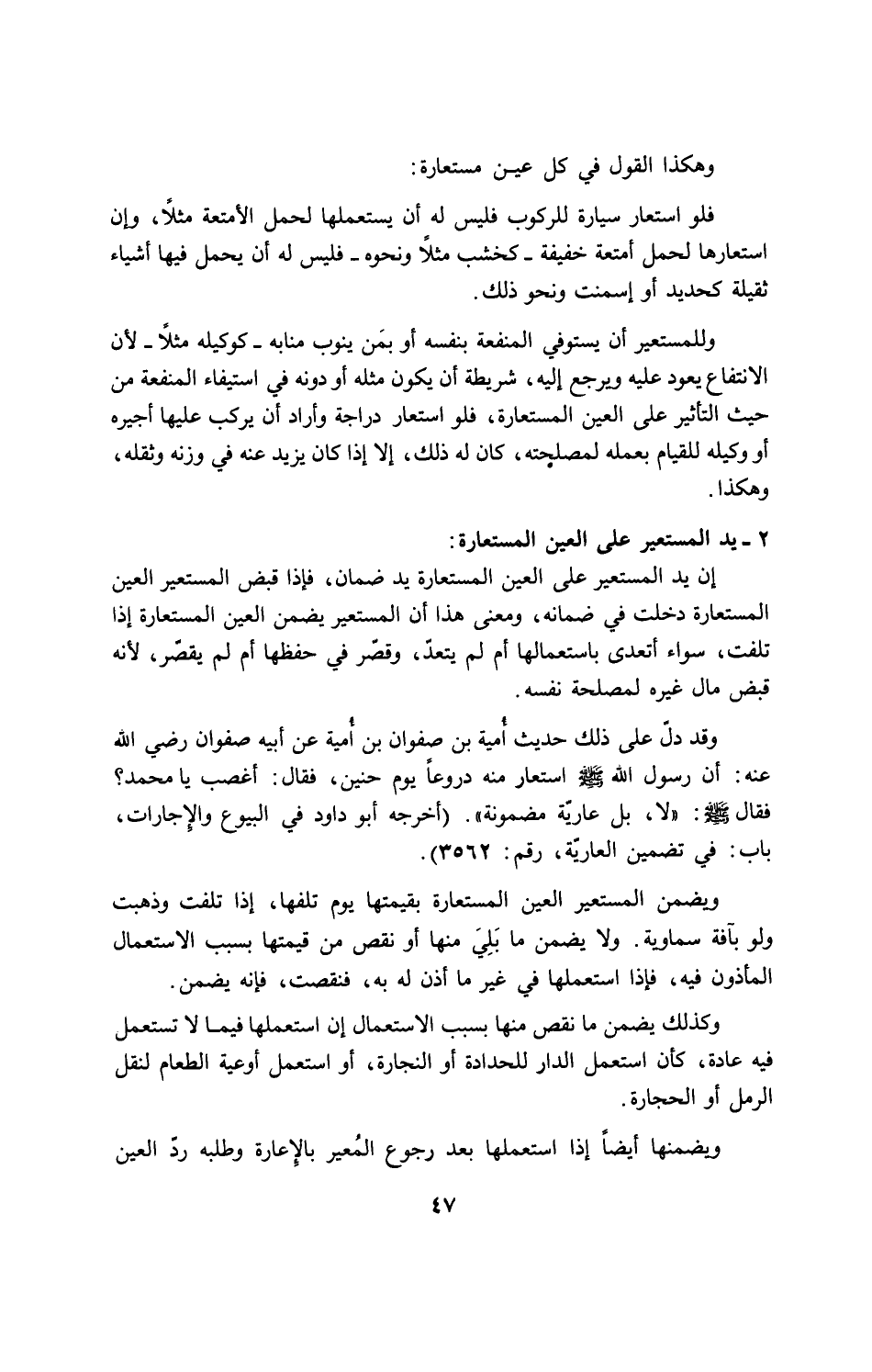 وقد دلّ على ذلك حديث أُمية بن صفوان بن أُمية عن ابيه صفوان رضى الله عنه: ان رسول الله صلى الله عليه وسلم استعار منه دروعاً يوم حنين، فقال: أغصب يا محمد؟ فقال صلى الله عليه وسلم: "لا، بل عاريَّة مضمونة" (اخرجه ابو داود في البيوع والإجارات، باب: في تضمين العارية، رقم: 3562).