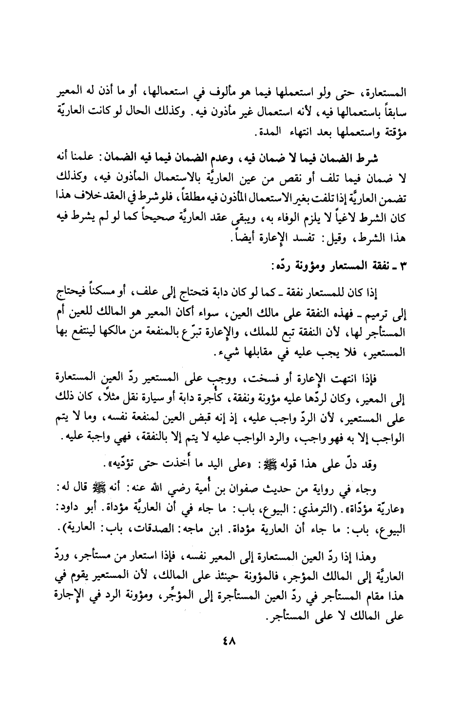 فإذا انتهت الاعارة او فسخت، ووجب على المستعير رد العين المستعارة الى المعير، وكان لردها عليه مؤونة ونفقة، كأجرة دابة او سيارة نقل مثلا، كان ذلك على المستعير، لأن الرد واجب عليه، إذ انه قبض العين لمنفعة نفسه، وما لا يتم الواجب إلا به فهو واجب، والرد الواجب عليه لا يتم الا بالنفقة، فهي واجبة عليه.