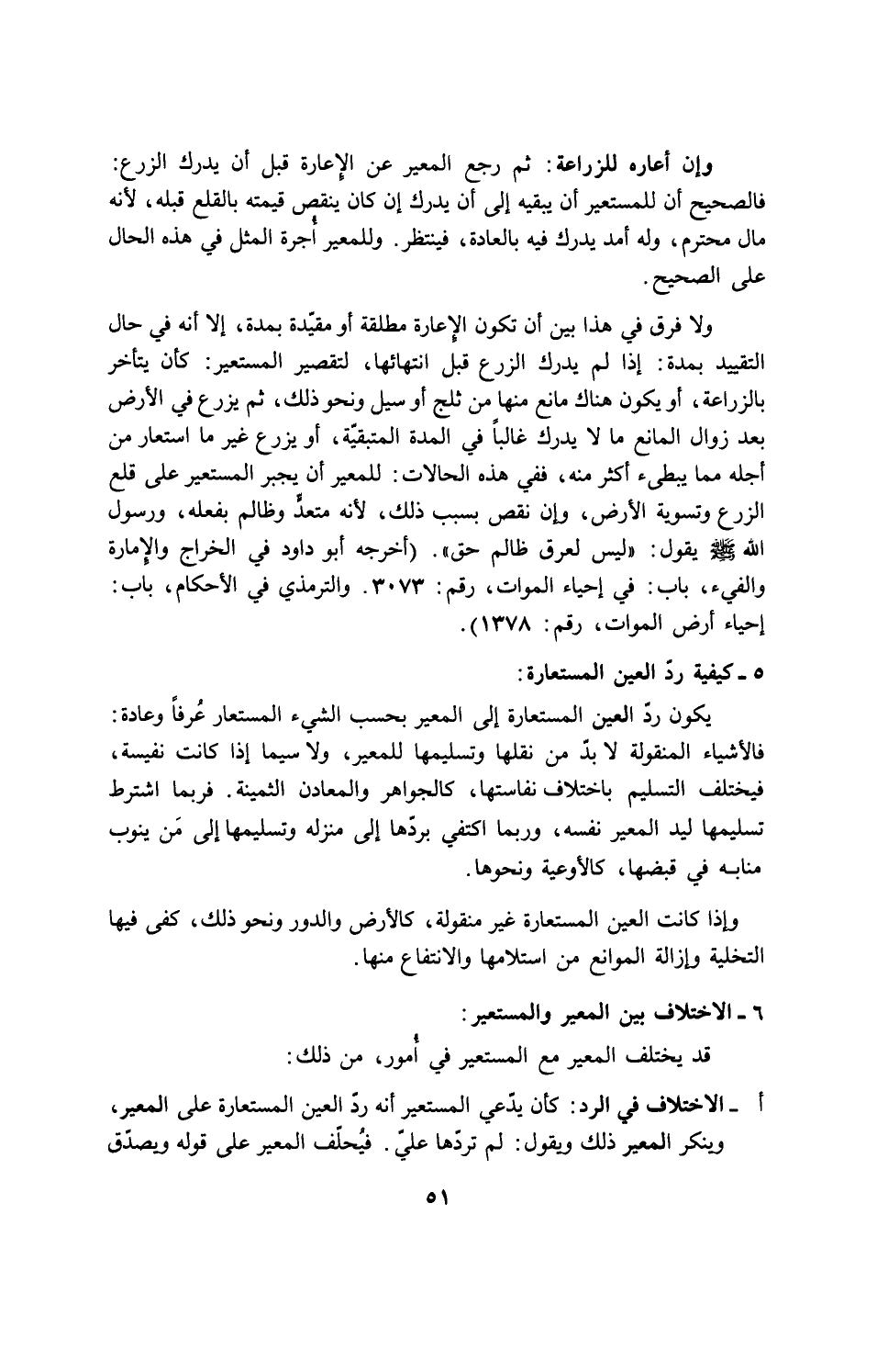 ولا فرق في هذا بين ان تكون الإعارة مطلقة او مقيدة بمدة، الا انه في حال التقييد بمدة: اذا لم يدرك الزرع قبل انتهائها، لتقصير المستعير: كأن يتأخر بالزراعة، او يكون هناك مانع منها من ثلج او سيل ونحو ذلك، ثم يزرع في الأرض بعد زوال المانع ما لا يدرك غابا في المدة المتبقية، او يزرع غير ما استعار من اجله مما يبطئ اكثر منه، ففي هذه الحالات: للمعير ان يجبر المستعير على قلع الزرع وتسوية الأرض، وان نقص بسبب ذلك، لأنه متعد وظالم بفعله، ورسول الله صلى الله عليه وسلم يقول: "ليس لعرق ظالم حق" (اخرجه ابو داود في الخراج والامارة والفئ، باب: في احياء الموات، رقم: 3073، والترمذي في الأحكام، باب: احياء ارض الموات، رقم: 1378).