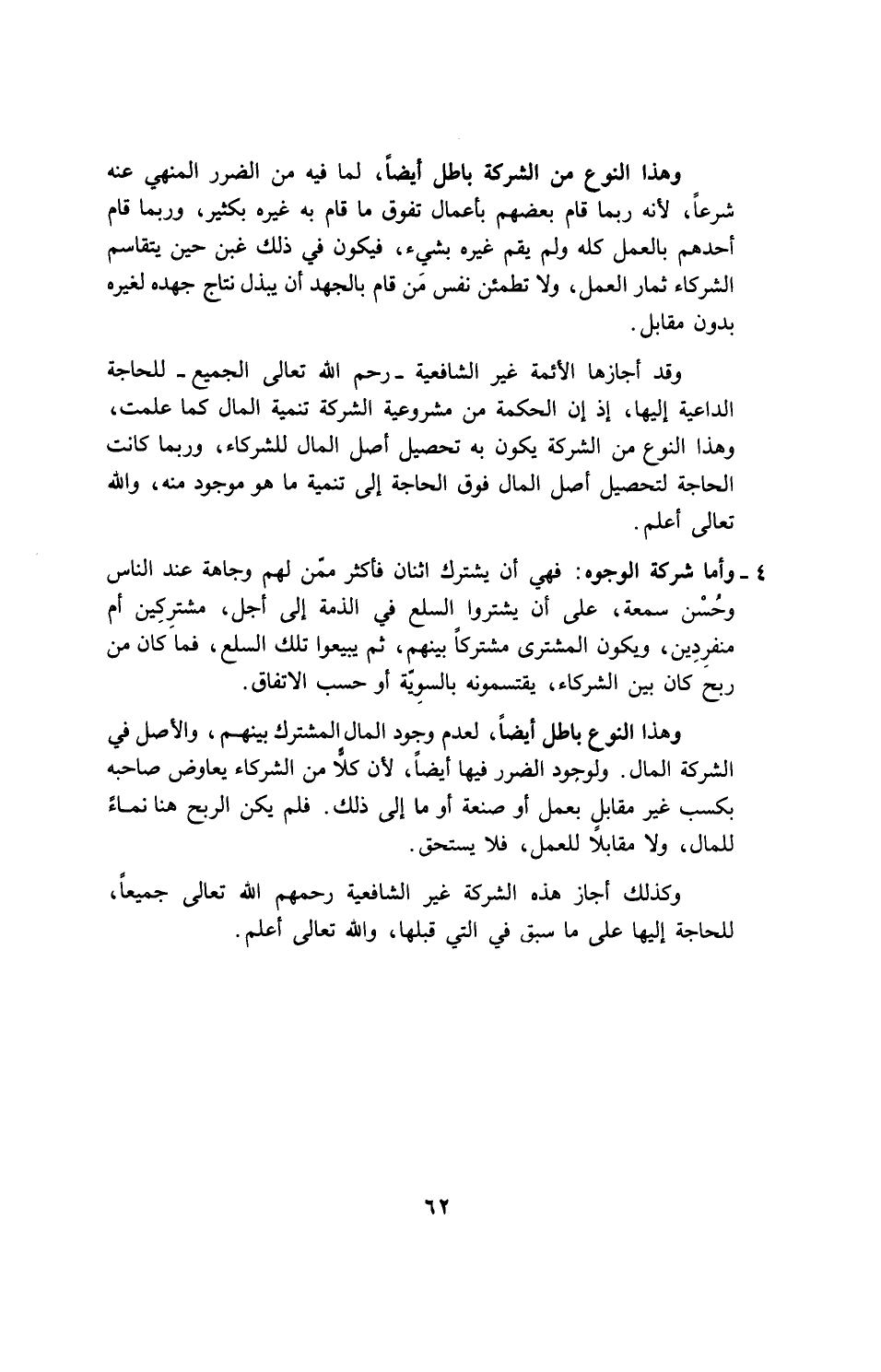 وقد أجازها الأئمة غير الشافعية - رحم الله تعالى الجميع - للحاجة الداعية اليها، إذ إن الحكمة من مشروعية الشركة تنمية المال كما علمت، وهذا النوع من الشركة يكون به تحصيل أصل المال للشركاء، وربما كانت الحاجة لتحصيل أصل المال فوق الحاجة إلى تنمية ما هو موجود منه، والله تعالى أعلم.