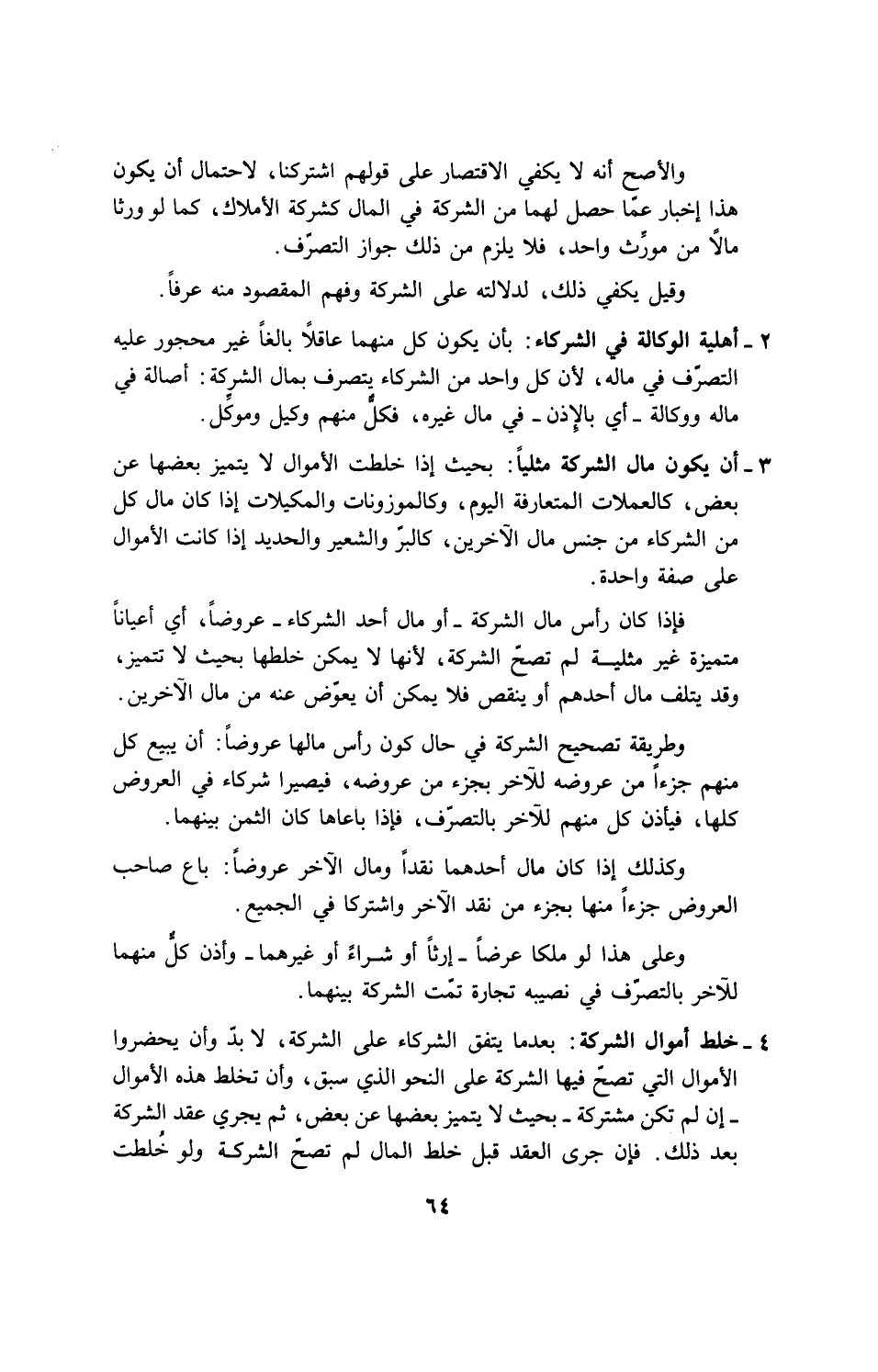 3 - أن يكون مال الشركة مثليا: بحيث إذا خلطت الأموال لا يتميز بعضها عن بعض، كالعملات المتعارفة اليوم، وكالموزونات والمكيلات اذا كان مال كل من الشركاء من جنس مال الآخرين، كالبرّ والشعير والحديد اذا كانت الأموال على صفة واحدة.