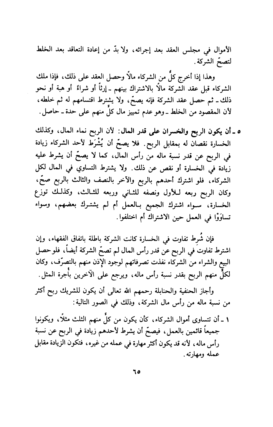 5 - أن يكون الربح والخسران على قدر المال: لأن الربح نماء المال، وكذلك الخسارة نقصان له بمقابل الربح. فلا يصح ان يشرط لأحد الشركاء زيادة في الربح عن قدر نسبة ماله من رأس المال، كما لا يصح ان يشرط عليه زيادة في الخسارة أو نقص عن ذلك، ولا يشترط التساوي في المال لكل الشركاء، فلو اشترك أحدهم بالربع والآخر بالنصف والثالث بالربع صح، وكان الربح ربعه للأول ونصفه للثاني وربعه للثالث، وكذلك توزع الخسارة، سواء أشترك الجميع بالعمل أم لم يشترك بعضهم، وسواء تساوَوْا في العمل حين الاشتراك أم اختلفوا.