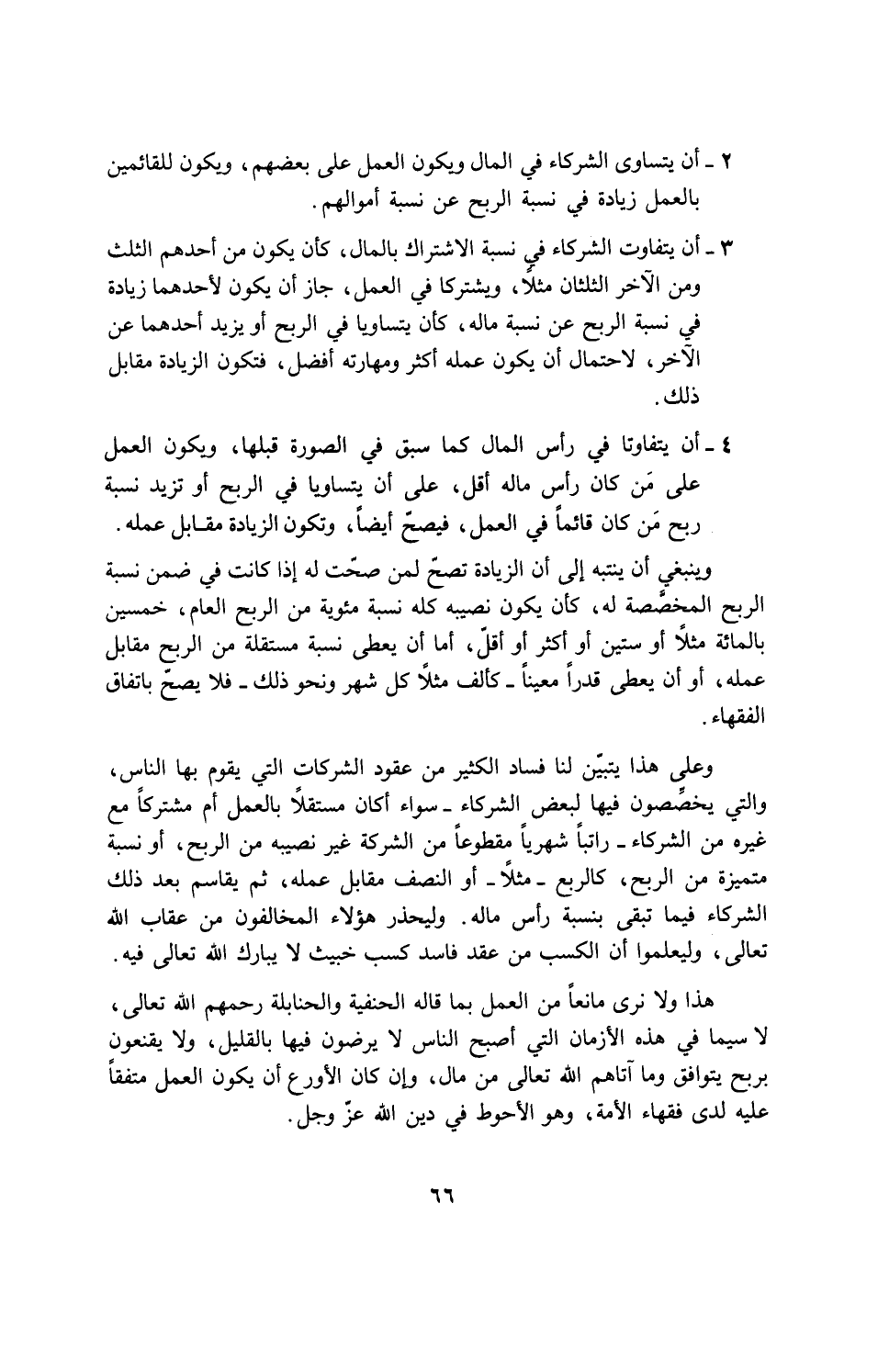 وعلى هذا يتبين لنا فساد الكثير من عقود الشركات التي يقوم بها الناس، والتي يخصِّصون فيها لبعض الشركاء - سواء أكان مستقلاً بالعمل أم شريكا مع غيره من الشركاء - راتباً شهرياً مقطوعاً من الشركة غير نصيبه من الربح، او نسبة متميزة من الربح، كالربع - مثلا - او النصف مقابل عمله، ثم يقاسم بعد ذلك الشركاء فيما تبقى بنسبة رأس ماله. وليحذر هؤلاء المخالفون من عقاب الله تعالى، وليعلموا ان الكسب من عقد فاسد كسب خبيث لا يبارك الله تعالى فيه.