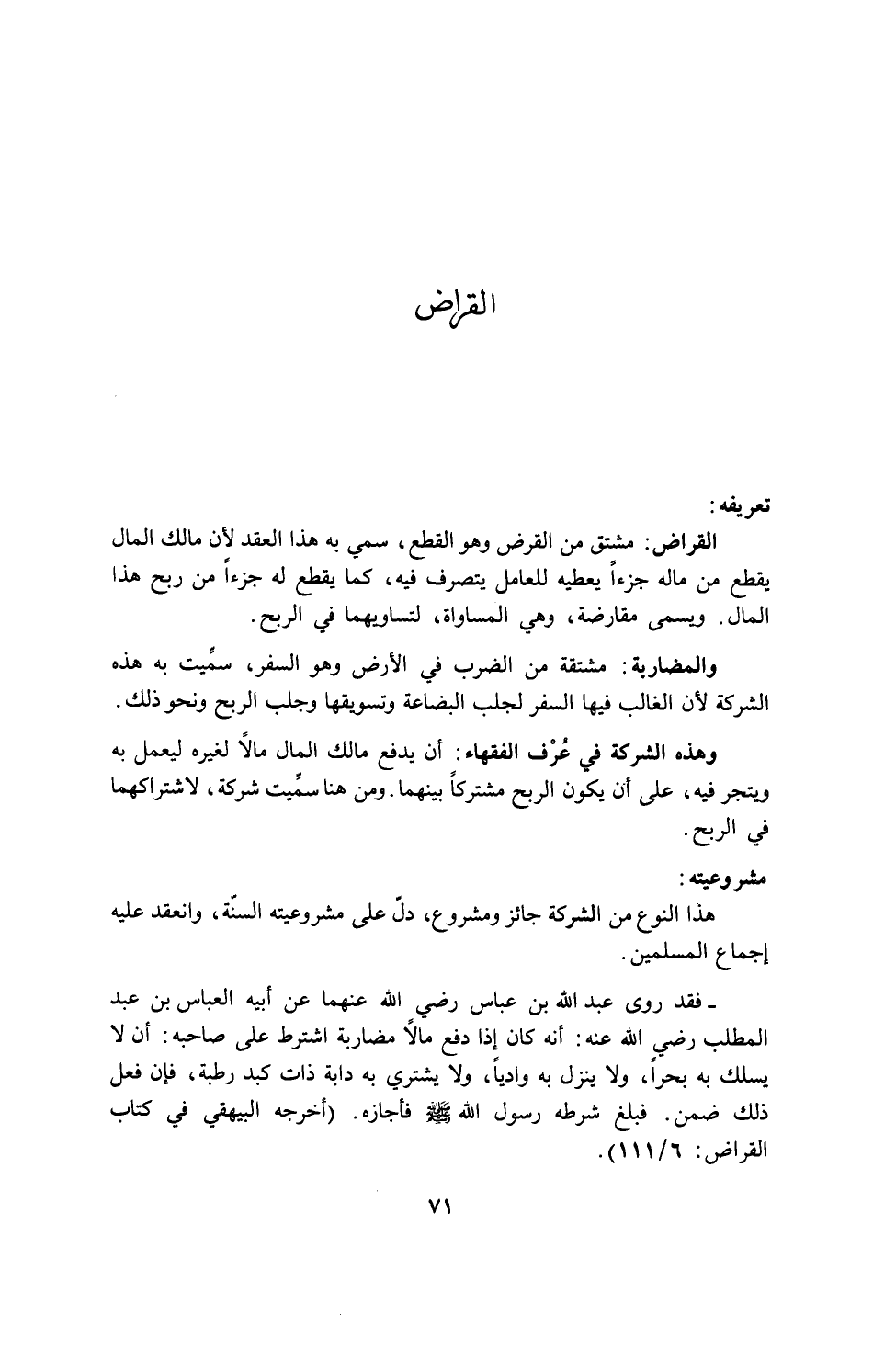 القراض: مشتق من القرض وهو القطع، سمى به هذا العقد لأن مالك المال يقطع من ماله جزءاً يعطيه للعامل يتصرف فيه، كما يقطع له جزءاً من ربح هذا المال، ويسمى مقارضة، وهو المساواة، لتساويهما في الربح.