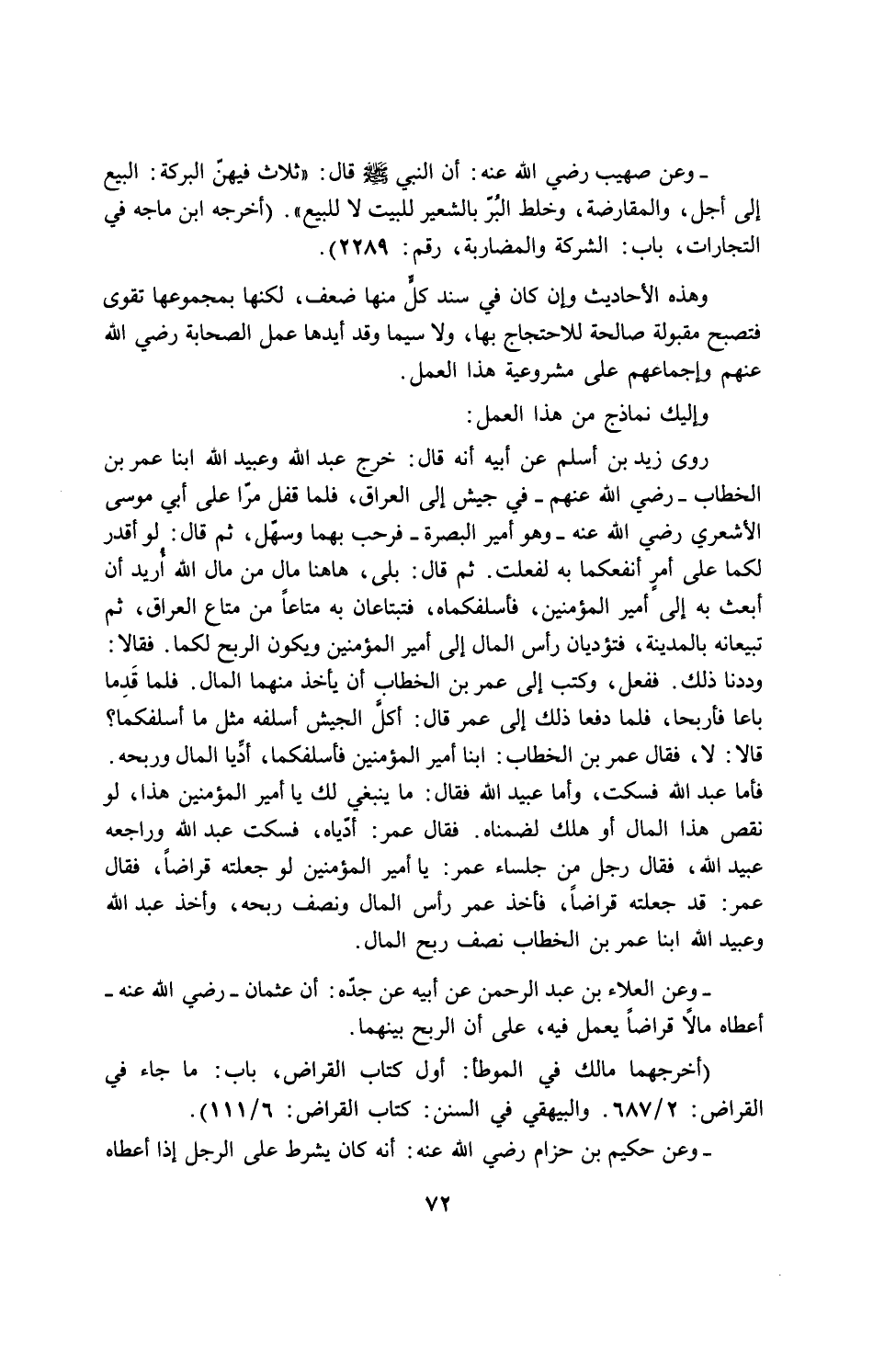روى زيد بن أسلم عن أبيه أنه قال: خرج عبدلله وعبيد الله ابنا عمر بن الخطاب - رضى الله عنهم - في جيش الى العراق، فلما قفل مرّا على ابي موسى الأشعري رضى الله عنه - وهو أمير البصرة - فرحب بهما وسهّل، ثم قال: لو أقدر لكما على أمر أنفعكما به لفعلت. ثم قال: بلى، هاهنا مال من مال الله أريد أن أبعث به إلى أمير المؤمنين، فأسلفكماه، فتبتاعان به متاعاً من متاع العراق، ثم تبيعانه بالمدينة، فتؤديان رأس المال الى أمير المؤمنين ويكون الربح لكما. فقالا: وددنا ذلك. ففعل، وكتب الى عمر بن الخطاب أن يأخذ منهما المال. فلما قدما باعا فأربحا، فلما دفعا ذلك الى عمر قال: أكل الجيش أسلفه مثل ما أسلفكما؟ قالا: لا، فقال عمر بن الخطاب: أبنا أمير المؤمنين فأسلفكما، أدّيا المال وربحه. فأما عبدالله فسكت، واما عبيد الله فقال: ما ينبغي لك يا أمير المؤمنين هذا، لو نقص هذا المال او هلك لضمناه. فقال عمر: أدّياه، فسكت عبدالله وراجعه عبيدالله، فقال رجل من جلساء عمر: يا أمير المؤمنين لو جعلته قراضاً، فقال عمر: قد جعلته قراضاً، فأخذ عمر رأس المال ونصف ربحه، واخذ عبدالله وعبيد الله ابنا عمر بن الخطاب نصف ربح المال.