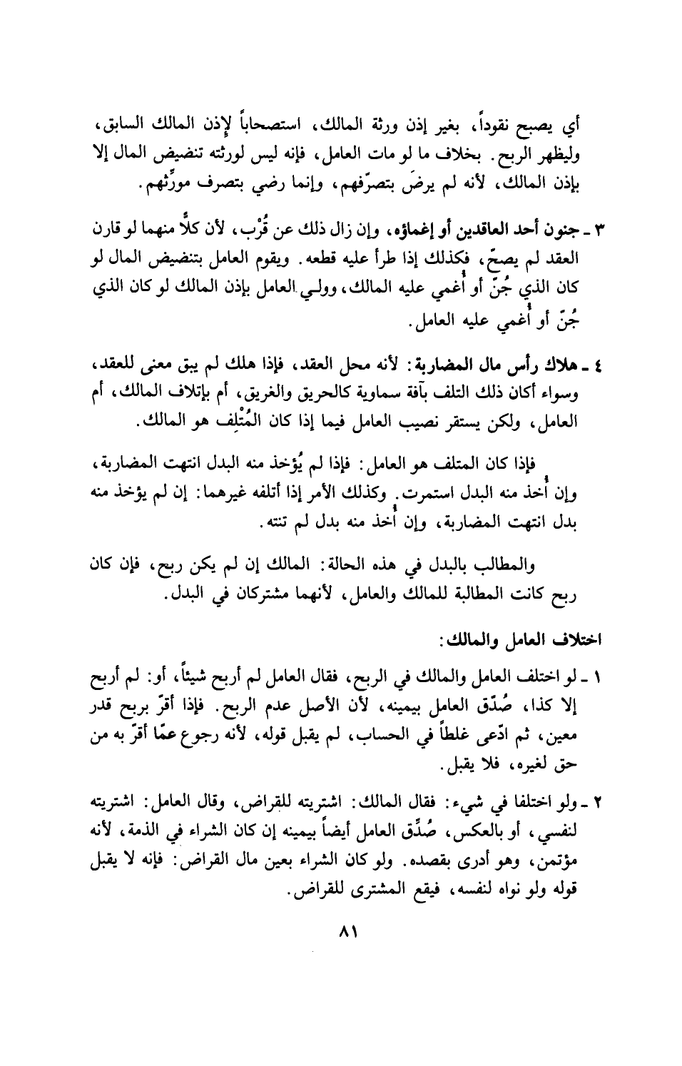3 - جنون أحد العاقدين أو إغماؤه، وإن زال ذلك عن قرب، لأن كلا منهما لو قارن العقد لم يصح، فكذلك اذا طرأ عليه قطعه. ويقوم العامل بتنضيض المال لو كان الذي جن أو أغمى عليه المال، وولى العامل بإذن المالك لو كان الذي جن أو أغمي عليه العامل.