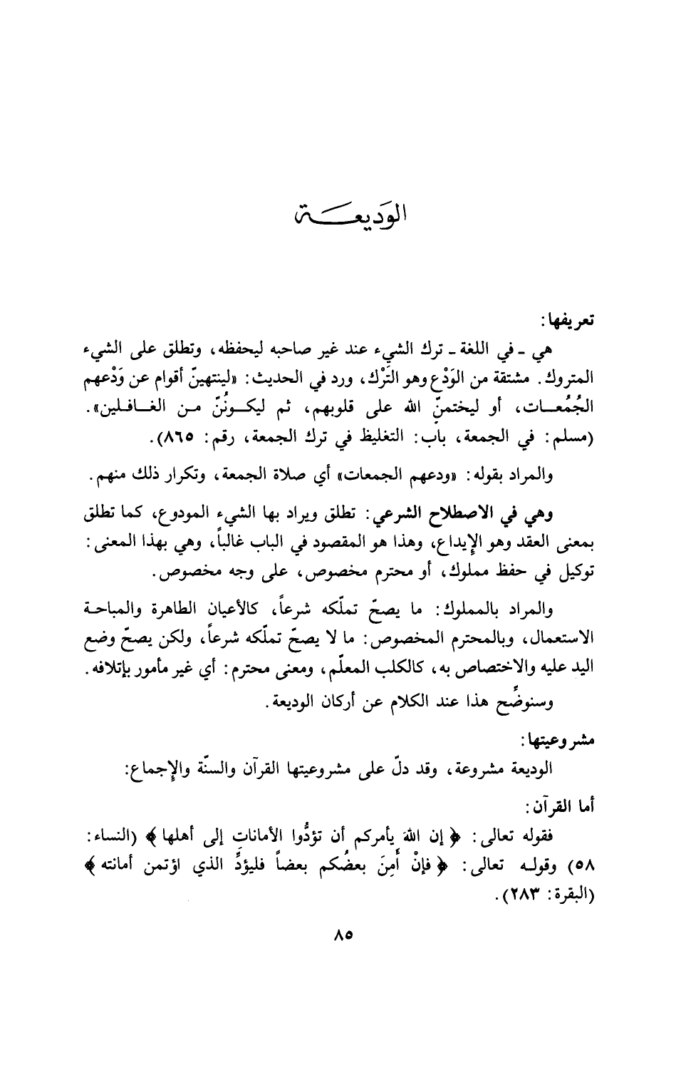 هي - في اللغة - ترك الشئ عند غير صاحبه ليحفظه، وتطلق على الشئ المتروك. مشتقة من الوَدْع وهو التَرْك، ورد في الحديث: "لينتهينّ أقوام عن ودعهم الجُمُعات، او ليختمنّ الله على قلوبهم، ثم ليكونُنْ من الغافلين". (مسلم: في الجمعة، باب: التغليظ في ترك الجمعة، رقم: 865).