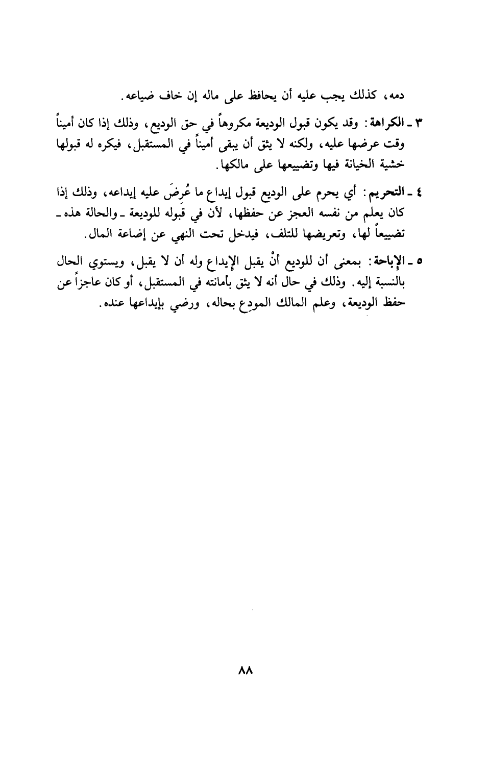 3 - الكراهة: وقد يكون قبول الوديعة مكروها في حق الوديع، وذلك اذا كان امينا وقت عرضها عليه، ولكنه لا يثق ان يبقى امينا في المستقبل، فيكره له قبولها خشية الخيانة فيها وتضييعها على مالكها.