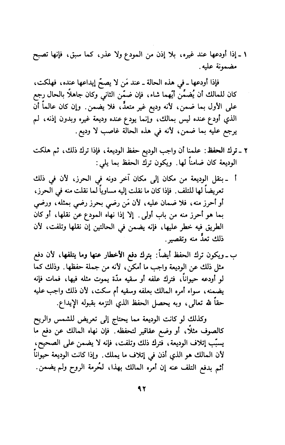 أ- ... بنقل الوديعة من مكان الى مكان آخر دونه في الحرز، لأن في ذلك تعريضا لها للتلف، فإذا كان ما نلت اليه مساوياً لما نقلت منه في الحرز، او أحرز منه، فلا ضمان عليه، لأن مَن رضى بحرز رضي بمثله، ورضى بما هو احرز منه من باب أولى، إلا إذا نهاه المودع عن نقلها، أو كان الطريق فيه خطر عليها، فإنه يضمن في الحالتين ان نقلها وتلفت، لأن ذلك تعدٍّ منه وتقصير.