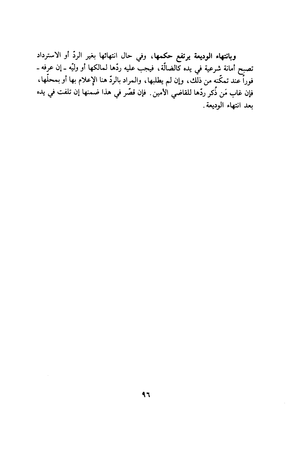 وبانتهاء الوديعة يرتفع حكمها، وفي حال انتهائها بغير الرد او الاسترداد تصبح أمانة شرعية في يده كالضاّلة، فيجب عليه ردّها لمالكها او وليّه - ان عرفه - فورا عند تمكّنه من ذلك، وان لم يطلبها، والمراد بالردّ هنا الإعلام بها أو بمحلّها، فإن غاب من ذُكر ردّها للقاضي الأمين، فإن قصّر في هذا ضمنها، ان تلفت في يده بعد إنتهاء الوديعة.