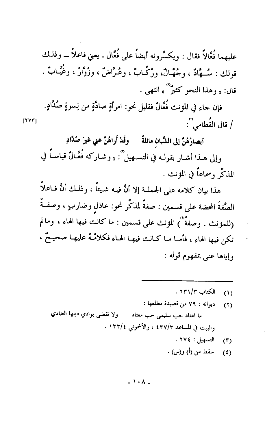 فإن جاء في المؤنث فُعَّالٌ فقليل نحو: امرأةٍ صادَّةٍ من نِسوةٍ صُدَّادٍ. / قال القُطامي:
