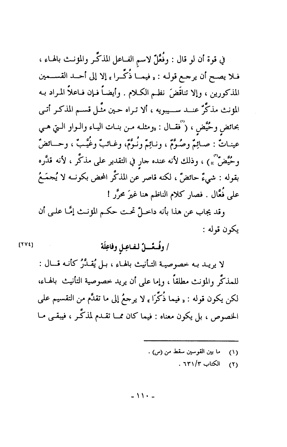 في قوة أن لو قال: وفُعَّلٌ لاسم الفاعل المذكر والمؤنث بالهاء، فلا يصح أن يرجع قوله: "فيما ذُكِّرا" إلا إلى أحد القسمين المذكورين، وإلا تناقضَ نظم الكلام. وأيضاً فإن فاعلاً المراد به المؤنث مذكر عند سيبويه، ألا تراه حين مثل قسم المذكر أتى بحائضٍ وحُيَّضٍ، (فقال: "ومثله من بنات الياء والواو التي هي عيناتٌ: صائمٌ وصُوَّمٌ، ونائمٌ ونُوَّمٌ، وغائب وغُيَّبٌ، وحائض وحُيَّضٌ")، وذلك لأنه عنده جارٍ في التقدير على مذكر، لأنه قدره بقوله: شيءٌ حائضٌ، لكنه قاصر عن المذكر المحض بكونه لا يُجمَعُ على فُعَّال. فصار كلام الناظم هنا غيرَ محرَّر!