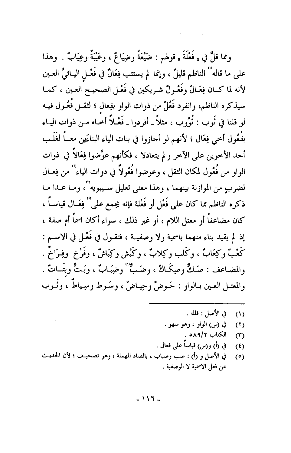 ومما قلَّ في "فَعْلَةَ" قولهم: ضَيْعَةٌ وضِيَاعٌ، وعيبة وعياب. وهذا على ما قاله الناظم قليل، وإنما م يستتب فِعَالٌ في فَعْلٍ اليائيِّ العين لأنه لما كان فِعَالٌ وفَعُول شريكين في فَعْل الصحيح العين، كما سيذكره الناظم، وانفرد فَعُلٌ من ذوات الواو بفِعالٍ؛ لثقل فُعُول فيه لو قلنا في ثوب: ثُوُوب، مثلاً - أفردوا - فَعْلاً أخاه من ذوات الياء بفُعُول أخي فِعَال؛ لأنهم لو أجازوا في بناء الياء البناءَين معاً لَغَلَب أحد الأخوين على الآخر يتعادلا، فكأنهم عوَّضوا فِعَالاً في ذوات الواو من فُعُول لمكان الثقل، وعوضوا فُعُول في ذوات الياء من فِعال لضربٍ من الموازنة بينهما، وهذا معنى تعليل سيبويه، وما عدا ما ذكره الناظم مما كان على فَعْل أو فَعْلَة فإنه يجمع على فِعَال قياساً، كان مضاعفاً أو معتل اللام، أو غير ذلك، سواء أكان اسماً أم صفة، إذ لم يقيد بناء منهما باسمية ولا وصفية، فتقول في فَعْل في الاسم: كَعْبٌ وكِعَابٌ، وكلب وكلاب، وكبش وكباش، وفرخ وفراخ. والمضاعف: صكٌّ وصِكَاك، وضب وضِباب، وبتٌّ وبِتَاتٌ. والمعتل العين بالواو: حَوضٌ وحِياضٌ، وسَوط وسِياطٌ، وثَوب